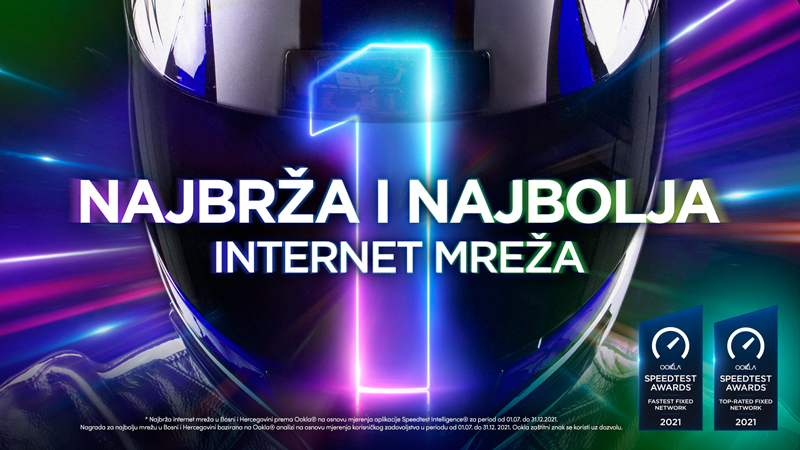 * Najbrža fiksna internet mreža u Bosni I Hercegovini prema Ookla® na osnovu mjerenja aplikacije Speedtest Intelligence® za period od 01.07. do 31.12.2021. Nagrada za najbolju mrežu u Bosni I Hercegovini bazirana na Ookla® analizi na osnovu mjerenja korisničkog zadovoljstva u periodu od 01.07. do 31.12.2021. Ookla zaštitni znak se koristi uz dozvolu.