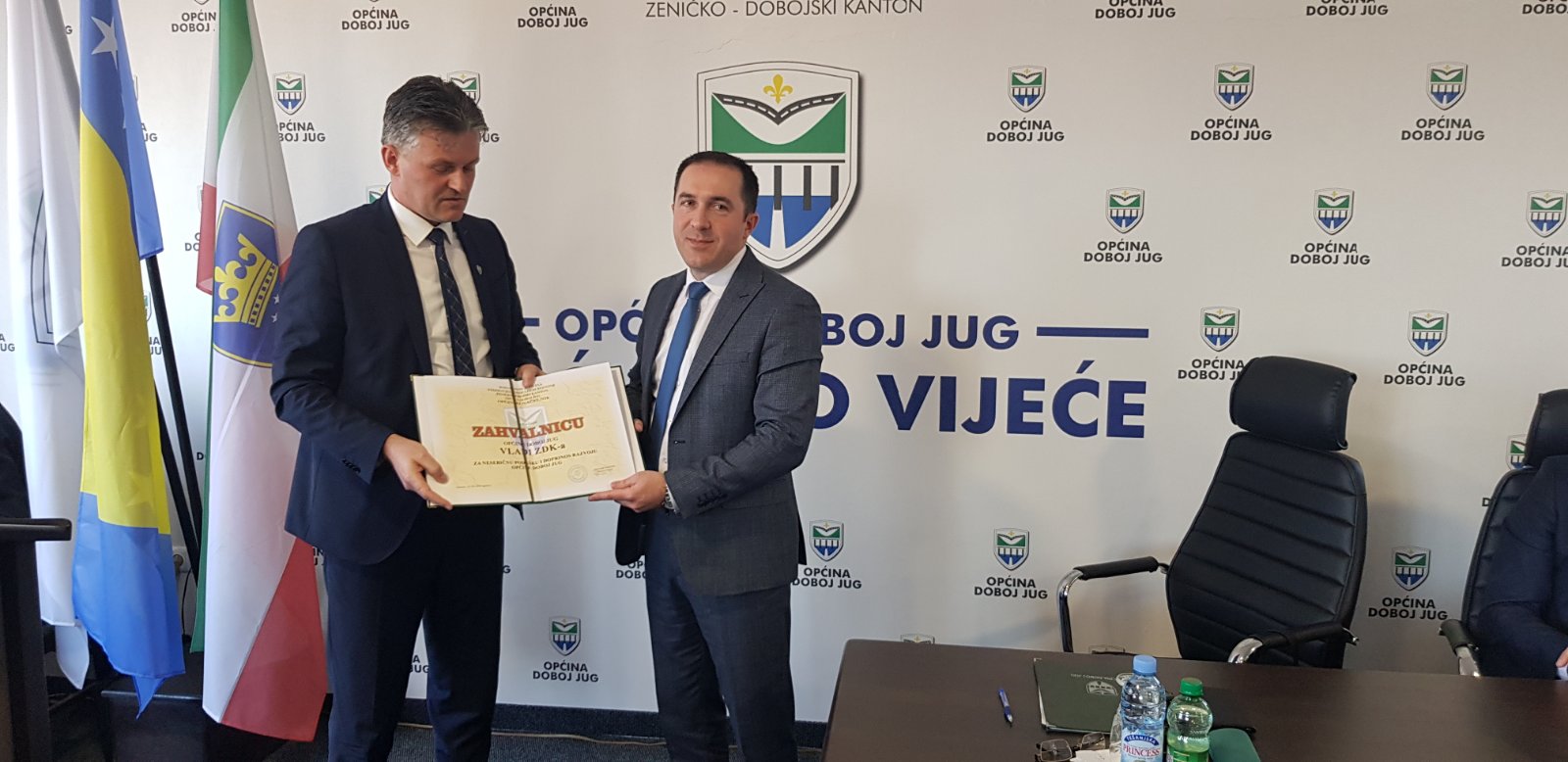 Općinski načelnik Mirnes Tukić uručio je premijeru Bašiću zahvalnicu Vladi Zeničko-dobojskog kantona “za nesebičnu podršku i doprinos razvoju Općine Doboj Jug”.