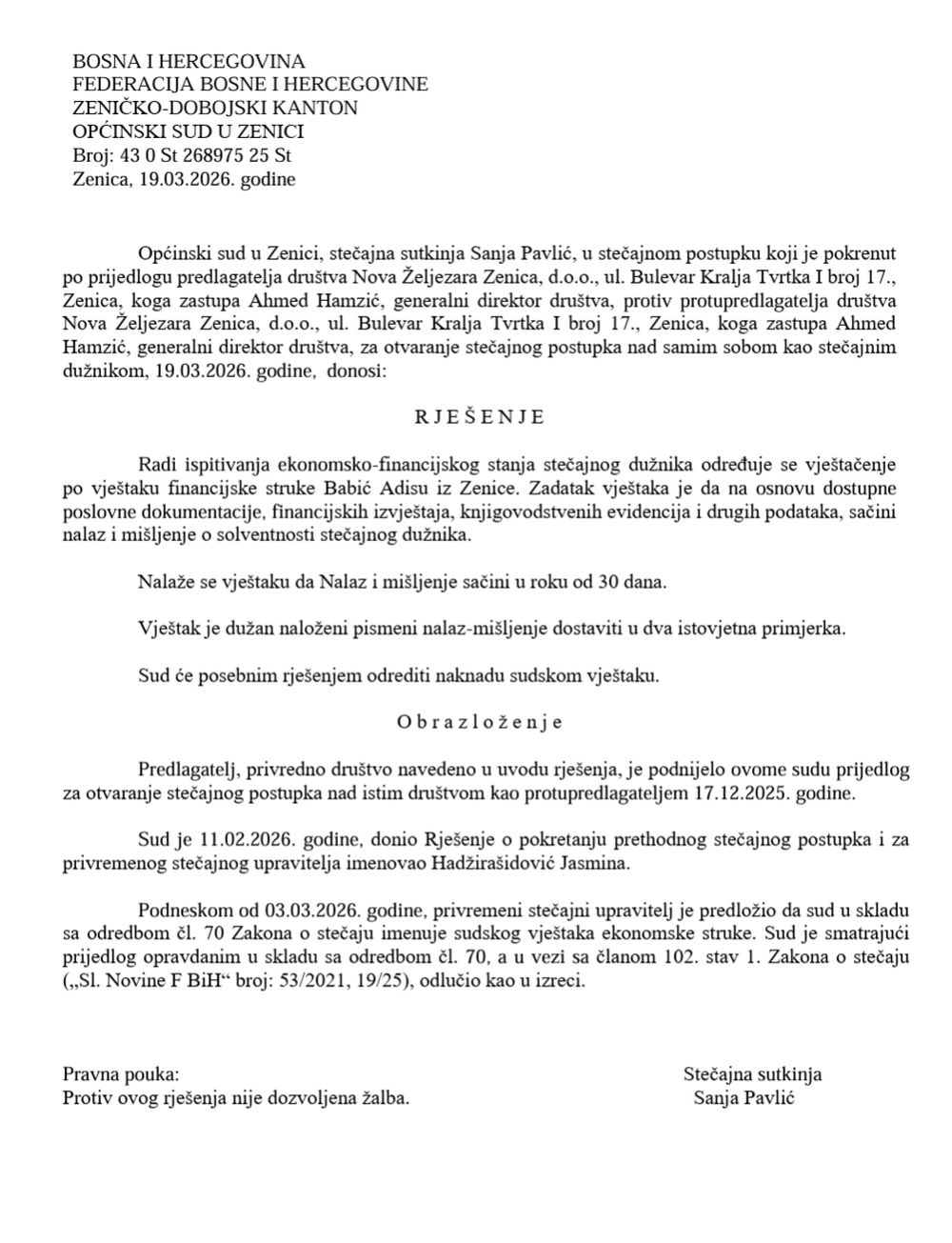 Sudski vještak Adis Babić iz Zenice uradiće vještačenje ekonomsko-finansijskog stanja stečajnog dužnika Nove Željezare d.o.o. Zenica radi utvđivanja stanja njegtove solventnosti.