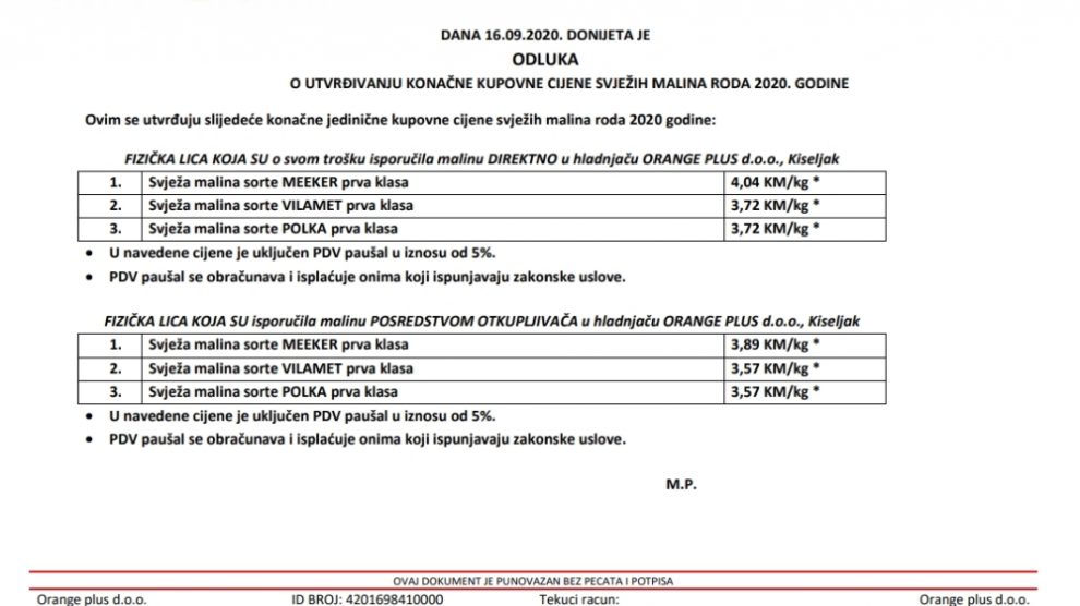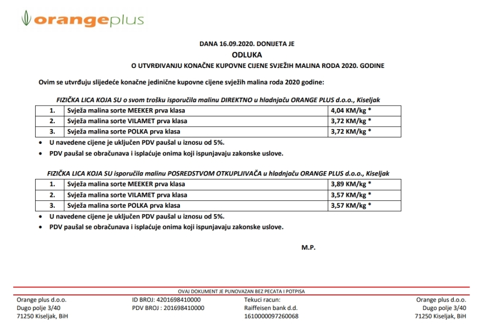 Hladnača ORANGE PLUS d.o.o. sa zadovoljstvom obavještava svoje cijenjene kooperante da je donijeta odluka o konačnim cijenama svježih malina roda 2020 godine.