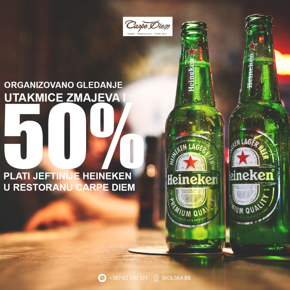 Dođite u Carpe Diem i stvorite uspomene dok navijate za našu reprezentaciju. Ne zaboravite da iskoristite sjajnu ponudu – 50% popusta na Heineken!