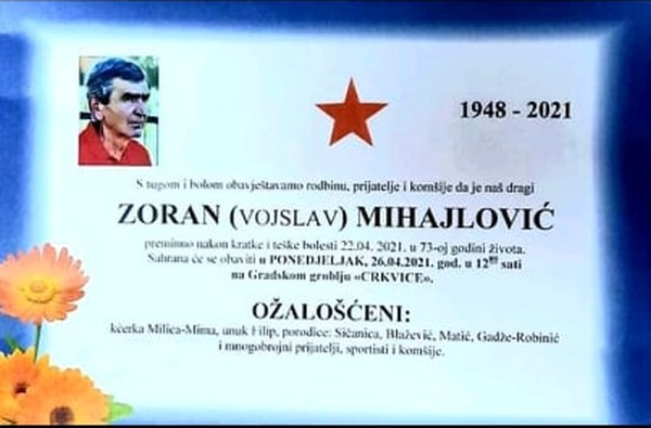 Sahrana Zoranu Mihajloviću će se obaviti u ponedjeljak 26.4.2021.godine u 12 sati na Gradskom groblju „Crkvice“ u Zenici.