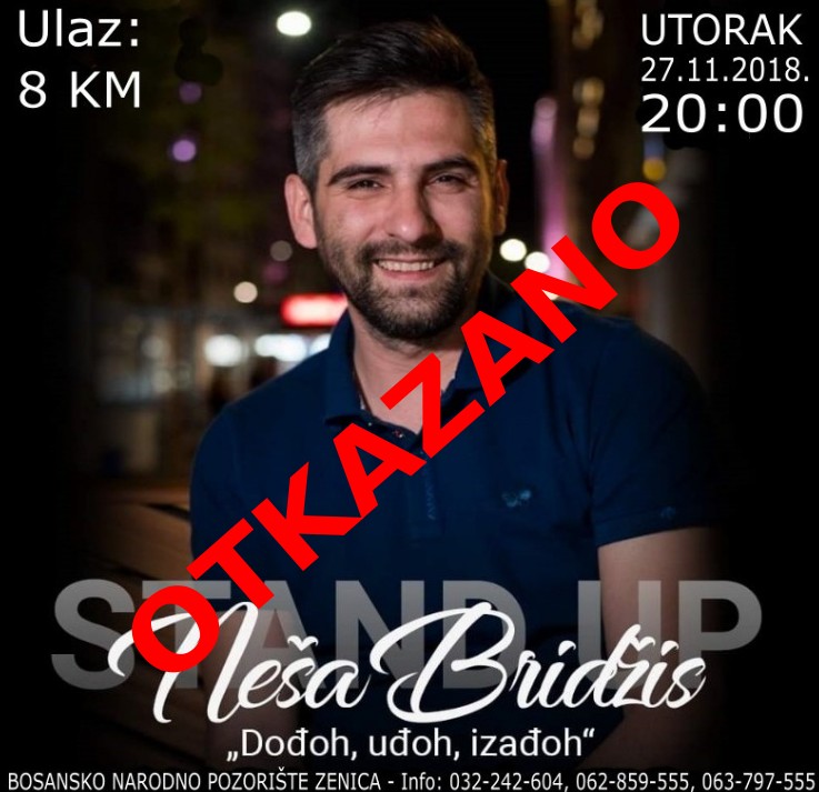 Otkazano gostovanje Neše Bridžisa zbog zdravstvenih problema – Obavještavamo cijenjenu publiku da je gostovanje Stand up komičara Neše Bridžisa OTKAZANO zbog zdravstvenih problema protagoniste.