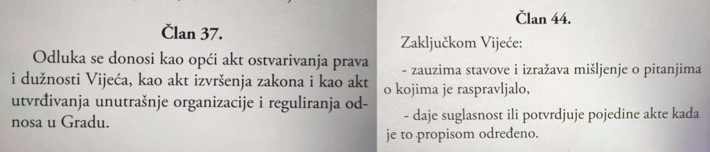Suština “problema” u je u tome što je Vijeće donijelo ZAKLJUČAK, a ne ODLUKU. U Odjeljku VI – AKTI VIJEĆA1. Vrsta akata – u članovima 37. i 44. je sve jasno rečeno – Prema Poslovniku Gradskog vijeća Zenica, Zaključak je vrsta pravnog akta kojim Vijeće izražava svoj stav o pitanju o kojem je raspravljalo ili daje saglasnost na druge pravne akte.