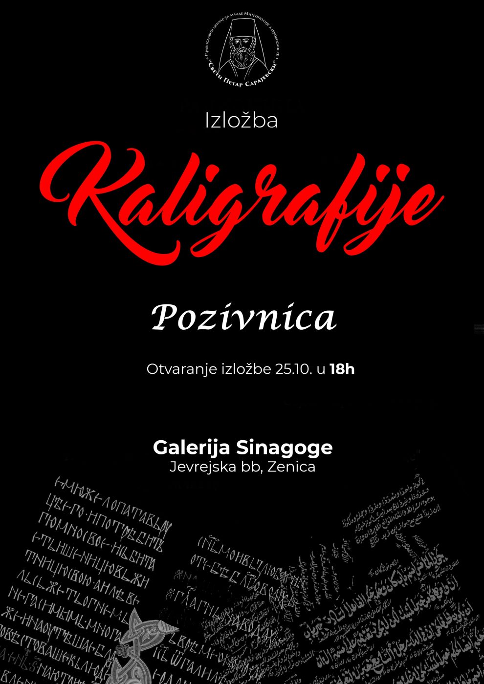 Otvaranje izložbe radova pravoslavne i islamske Kaligrafije – Pravoslavni centar za mlade Mitropolije dabrobosanke „Sveti Petar Sarajevski“ u saradnji sa Odborom za međureligijsku saradnju u Zenici, ima čast da Vas pozove na otvaranje izložbe radova pravoslavne i islamske Kaligrafije u petak, 25. oktobra, sa početkom u 18 časova. Otvaranje izložbe biće održano u galeriji Sinagoge u Zenici.
