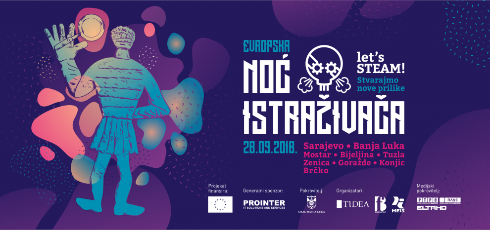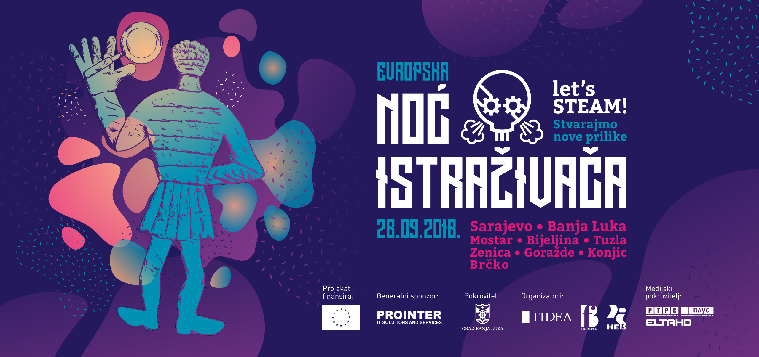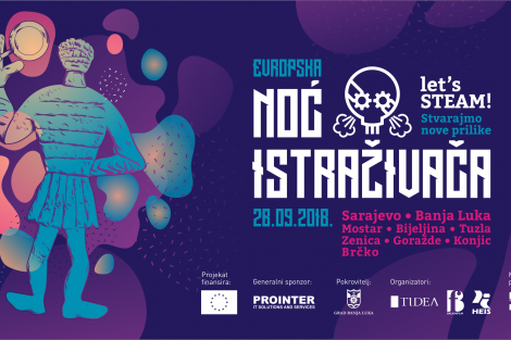 Otvoren konkurs za učešće u Noći istraživača 2018 – Sedmu godinu za redom u Bosni i Hercegovini se obilježava najzabavnija noć nauke i istraživačkog rada, “Evropska Noć istraživača 2018” pod sloganom “Let’s STEAM: Stvarajmo nove prilike”. Ove godine manifestacija će biti obilježena u petak, 28. septembra, sa početkom u 17.00 časova, u devet bh. gradova – u Banjaluci, Bijeljini, Brčkom, Goraždu, Konjicu, Mostaru, Sarajevu, Tuzli i Zenici.