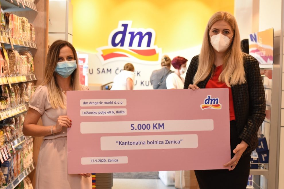 Početak rada na još jednoj lokaciji kompanija dm je obilježila i društveno odgovornim angažmanom u lokalnoj zajednici te je Kantonalnoj bolnici Zenica uručena donacija zaštitne opreme u vrijednosti od 5.000 KM. Melisa Hečimović, regionalna menadžerica dm-a uručila je ček donacije Emini Ismičić, šefici Službe prodajne usluge JU Kantonalne bolnice Zenica.