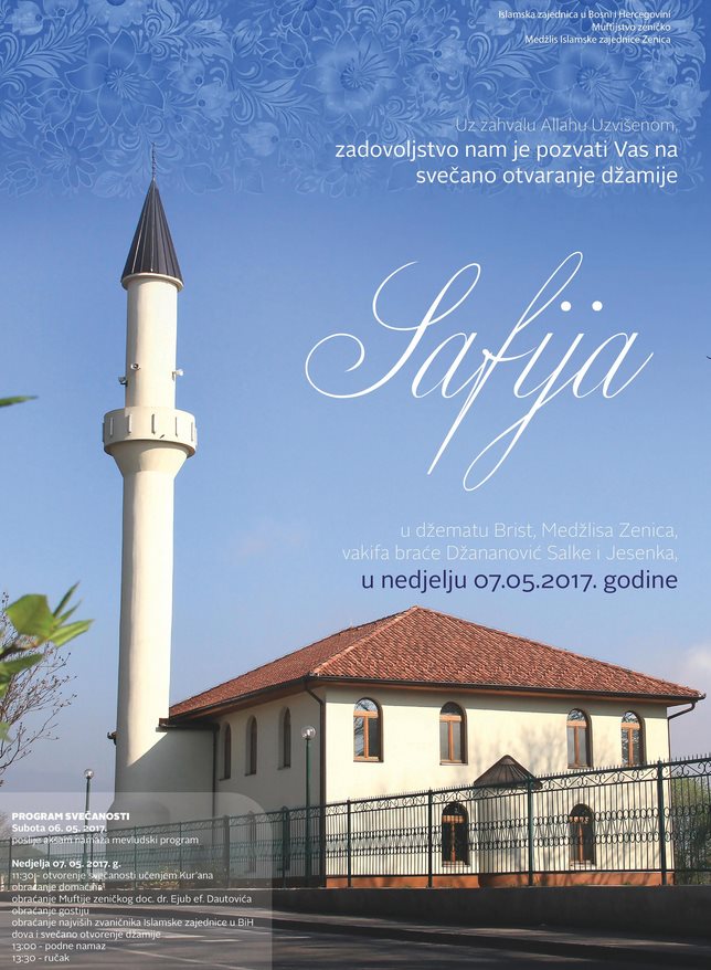 Otvorenje džamije “Safija” u džematu Brist – Medžlis IZ-e Zenica i džemat Brist vas uz zahvalu Allahu dž.š. pozivaju na svečano otvorenje džamije “Safija” na Bristu, Medžlis Islamske zajednice Zenica, vakifa braće Džananović Salke i Jasenka, u nedjelju 07. 05. 2017. godine.