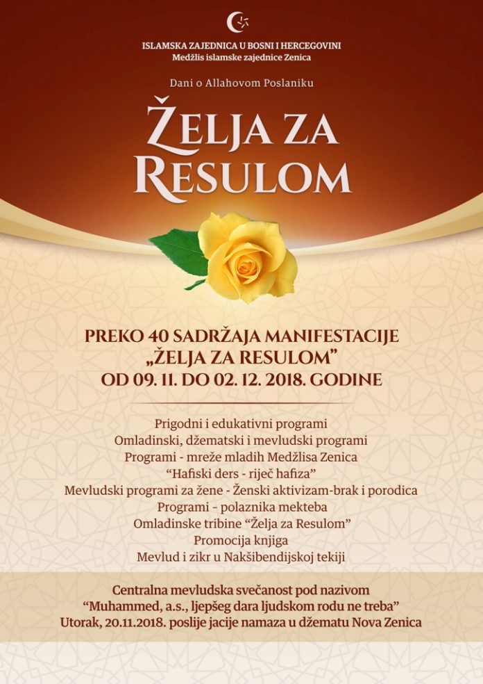Manifestacija tradicionalno već šesnaestu godinu nosi naziv „Želja za Resulom” i trajat će 23 dana, u periodu od 09. 11. 2018. godine do 02. 12. 2018. godine, sa preko 50 različitih sadržaja. Manifestacija će sadržavati mevludske programe, prigodne programe i zikr, večeri Kur’ana, kazivanja o Božijem Poslaniku, promociju knjiga, programe za omladinu, žene, te večer Kur’ana.