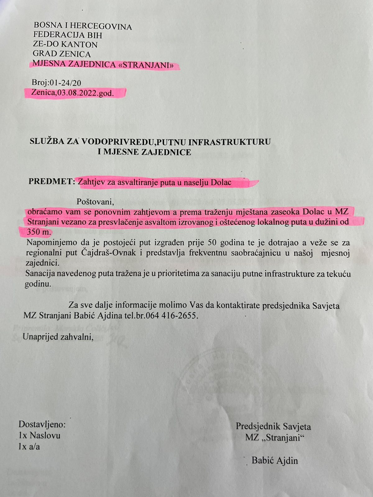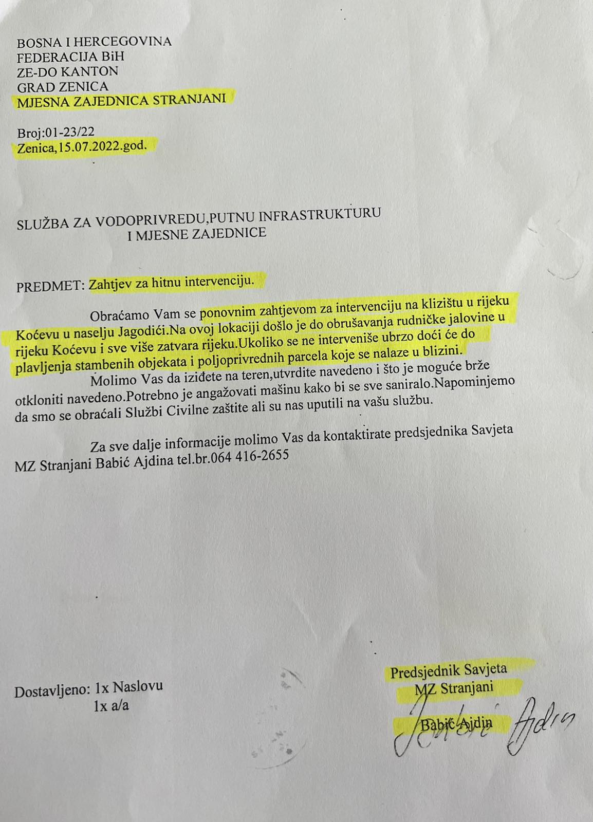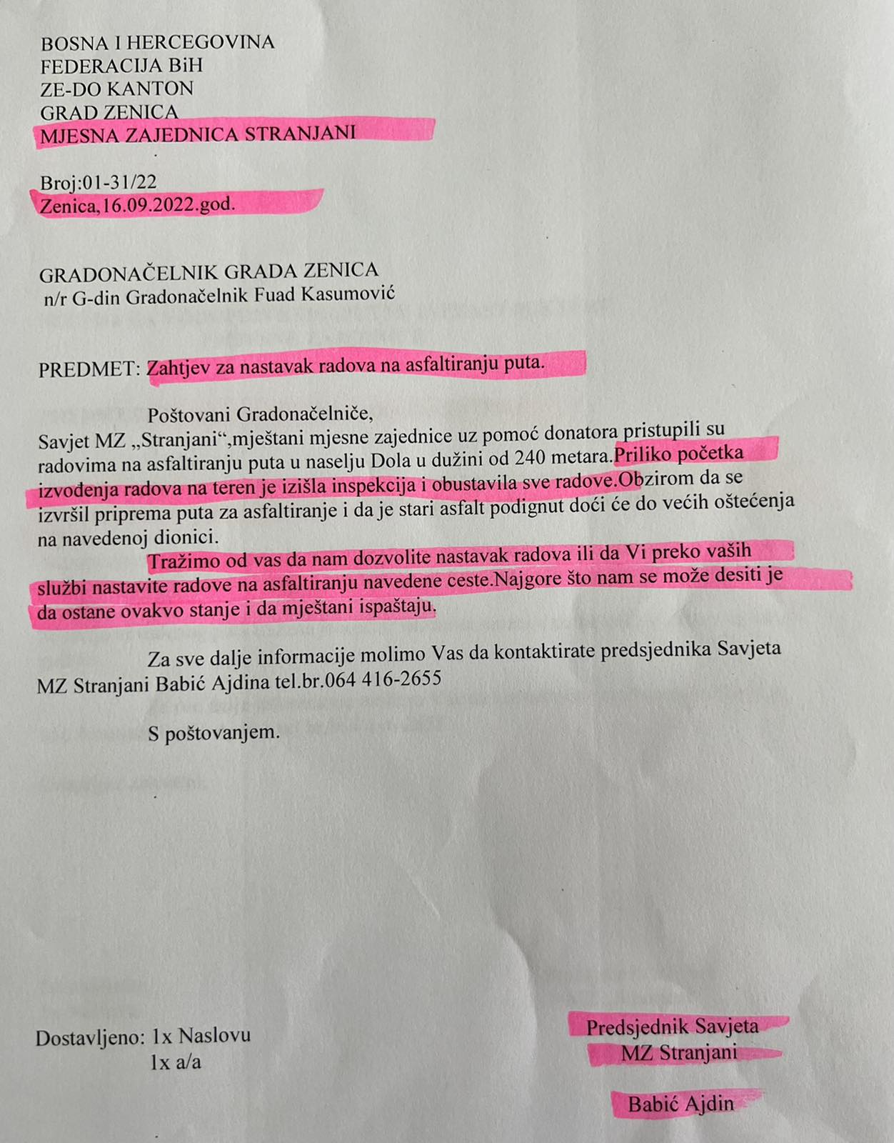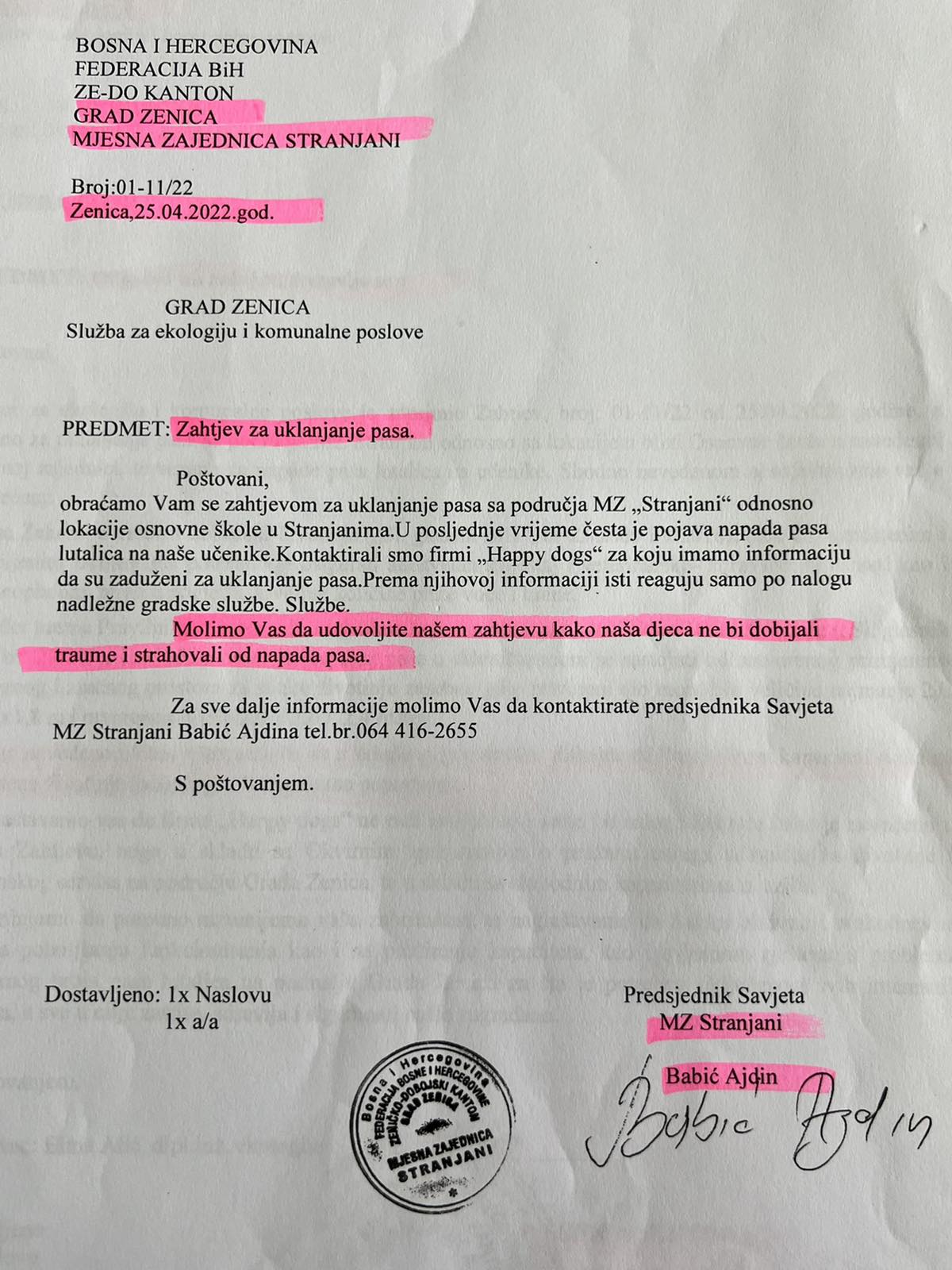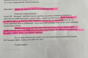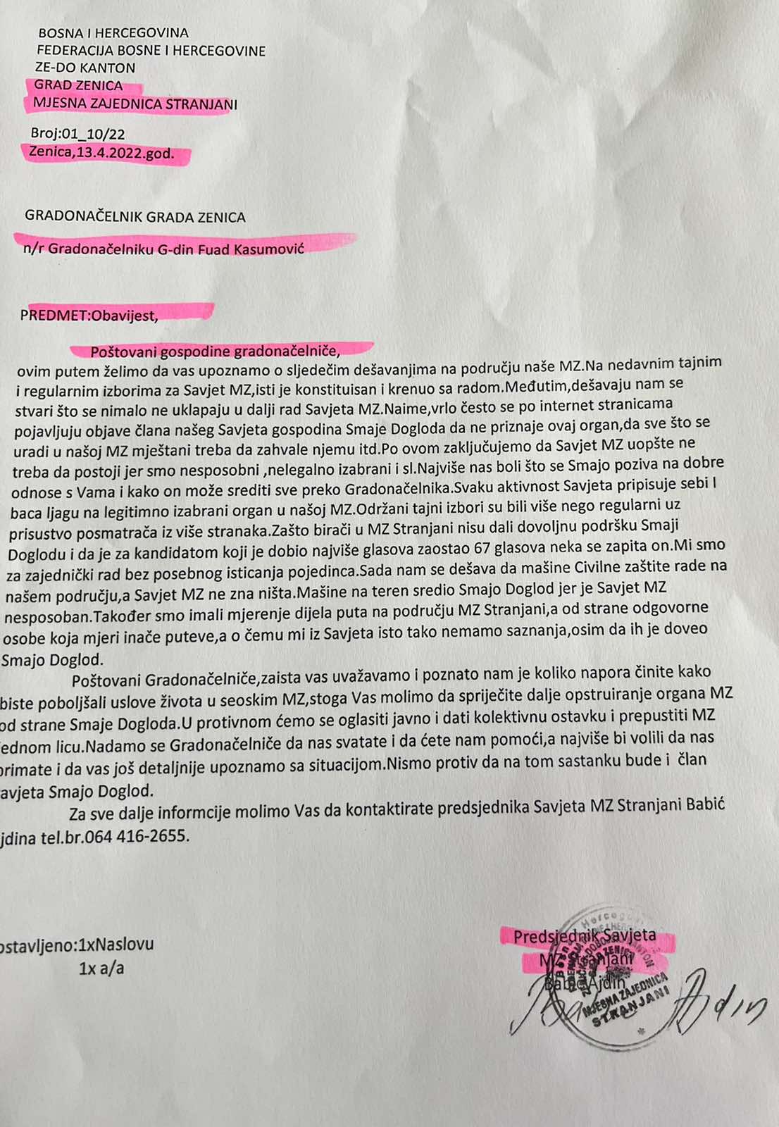 Poštovani gradonačelniče Zenice, Fuade Kasumoviću, poštovani pomoćnici gradonačelnika i zaposlenici službi koje se bave problemima mjesnih zajednica, ovim putem se, nakon desetina dopisa, poziva, zahtjeva i molbi, obraćamo Vama i javnosti nadajući se da ćete napokon obratiti pažnju na brojne probleme mještana MZ Stranjani.