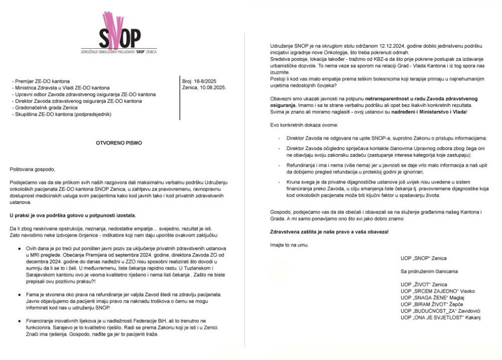 Podsjećamo vas da ste prilikom svih naših razgovora dali maksimalnu verbalnu podršku Udruženju onkoloških pacijenata ZE-DO kantona SNOP Zenica, u zahtjevu za pravovremenu, ravnopravnu dostupnost medicinskih usluga svim pacijentima kako kod javnih tako i kod privatnih zdravstvenih ustanova.
