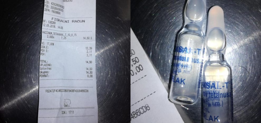 • Na kraju, hvala Bogu dragom i hvala mojoj prijateljici I.R.B. koja se danas zadesila u Kantonu Sarajevo i uspjela kupiti vakcinu koja život znači, ANA-TE ili TETANUS, što dostavljam kao dokaz o kupljenoj vakcini.