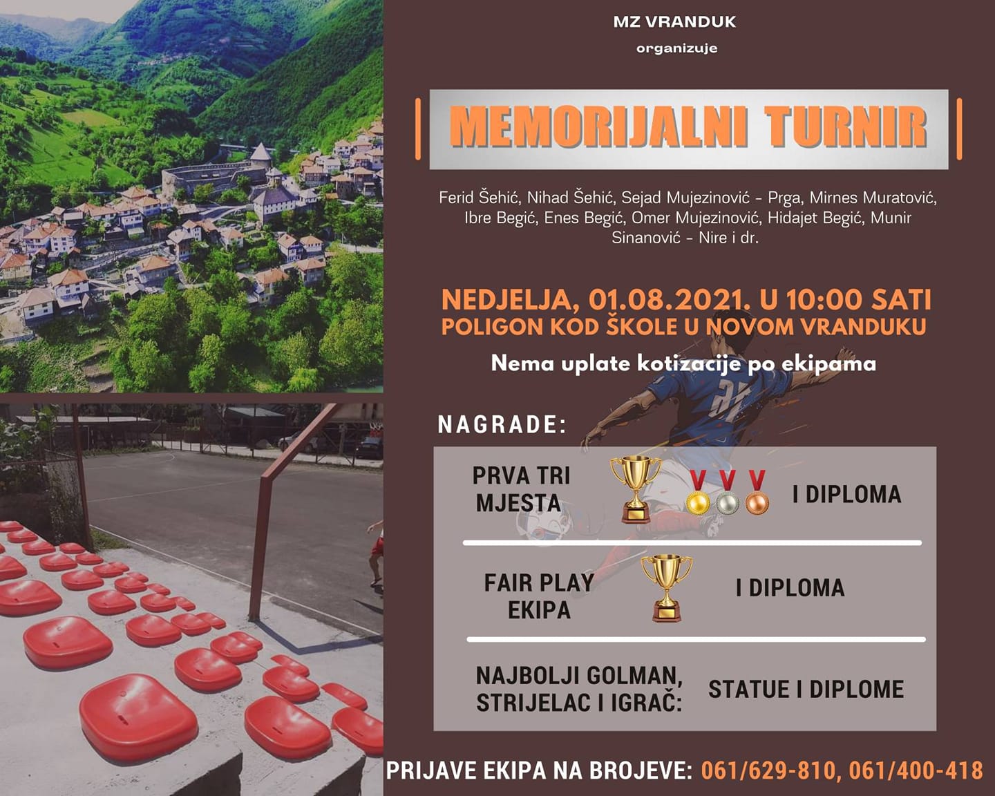 Turnir se održava na obnovljenom poligonu kod škole u Novom Vranduku i nema uplate kotizacije po ekipama. (Teren urađen sa novim asfaltom, urađene nove betonske tribine, postavljene plastične stolice na tribinama, zamjenjana ograda oko poligona i dodatno ojačana iza golova-stativa, postavljene klupe za ekipe i drugo, nap.a.). Prijave ekipa na brojeve 061/ 629 810 i 061/400 418.