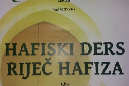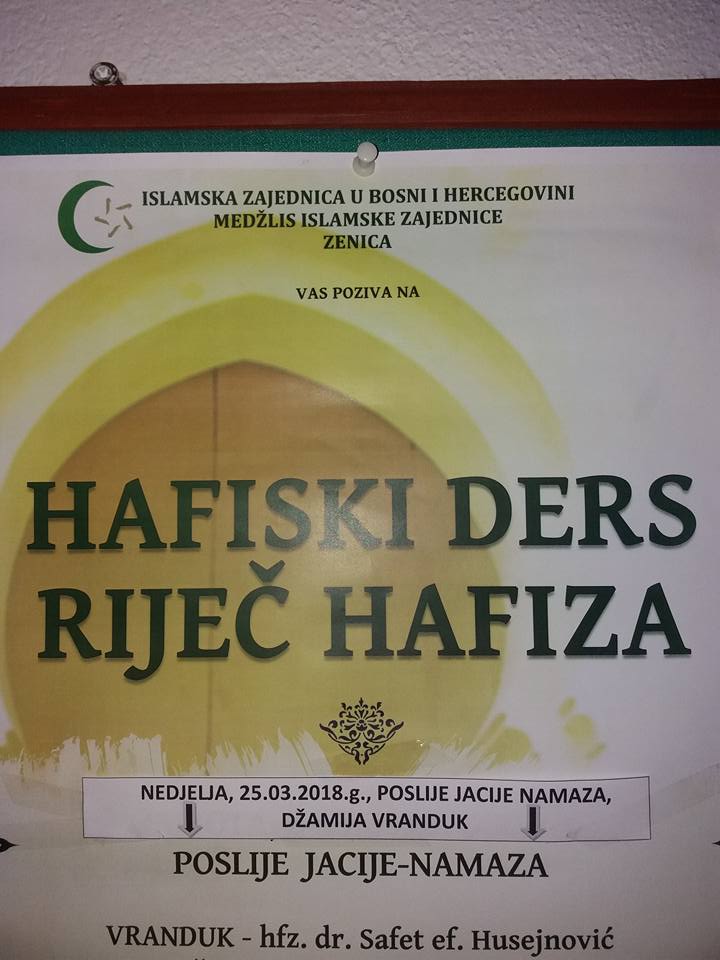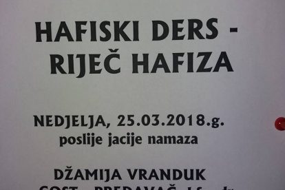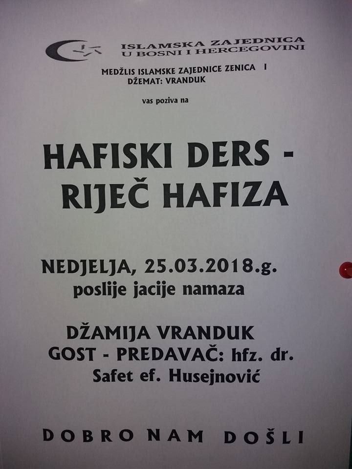 Ove nedjelje u Vranduku predavanje pod nazivom Hafiski ders – riječ hafiza – Medžlis Islamske zajednice Zenica i džemat Vranduk ove nedjelje, 25.03. u džematu Vranduk organizuju predavanje pod nazivom Hafiski ders – riječ hafiza, koje će se održati poslije Jacije-namaza, čiji je početak klanjanja u 20,38 sati. (Od ove nedjelje počinje ljetno računanje vremena, kada ćemo satove pomjeriti za jedan sat unaprijed – vrijeme u 2 sata računa se kao 3, nap.a.).