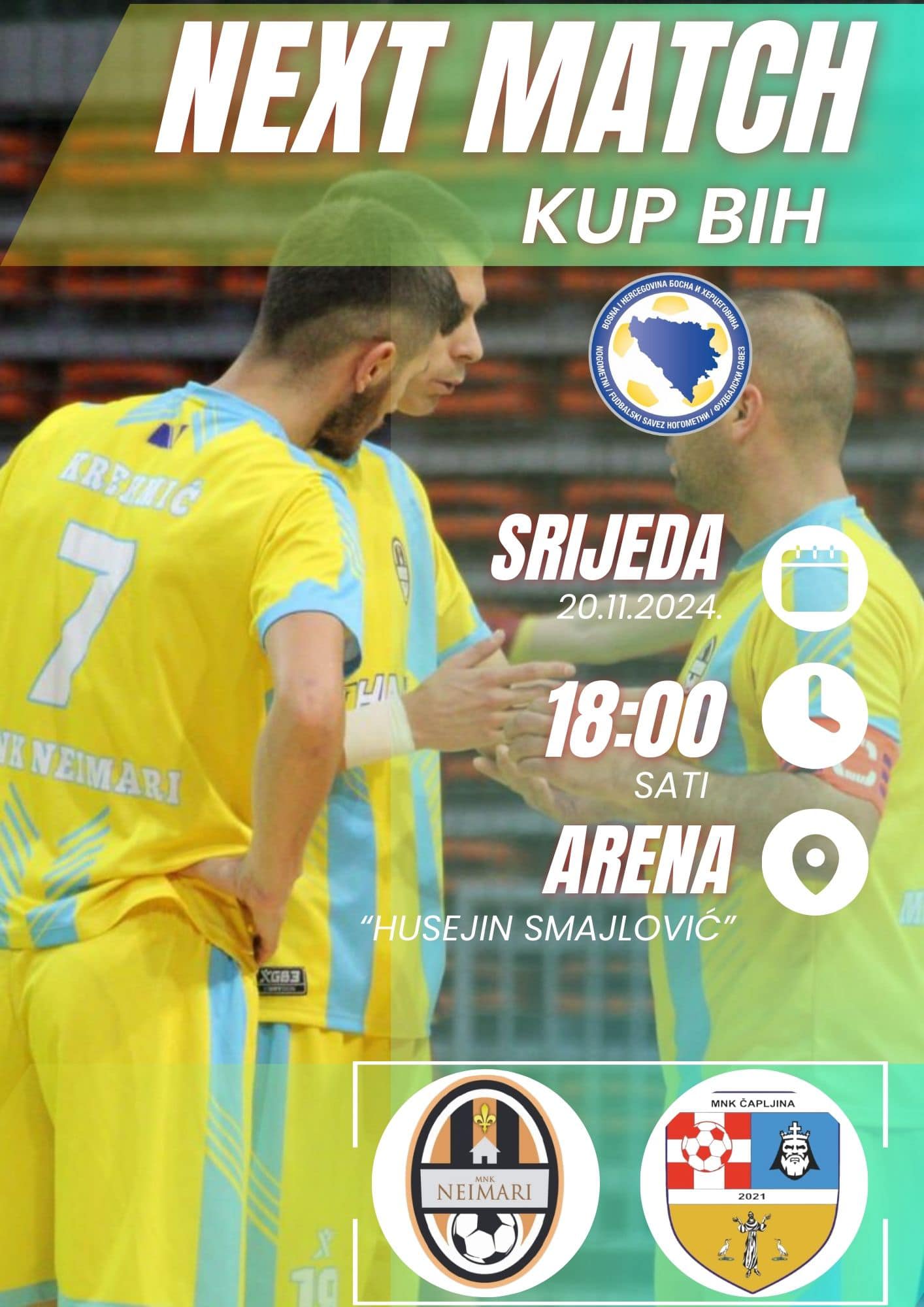 Kup utakmica, MNK Neimari – MNK Čapljina, igra se ove srijede, 20.11.2024.godine, u gradskoj Areni „Husejin Smajlović“ od 18 sati.