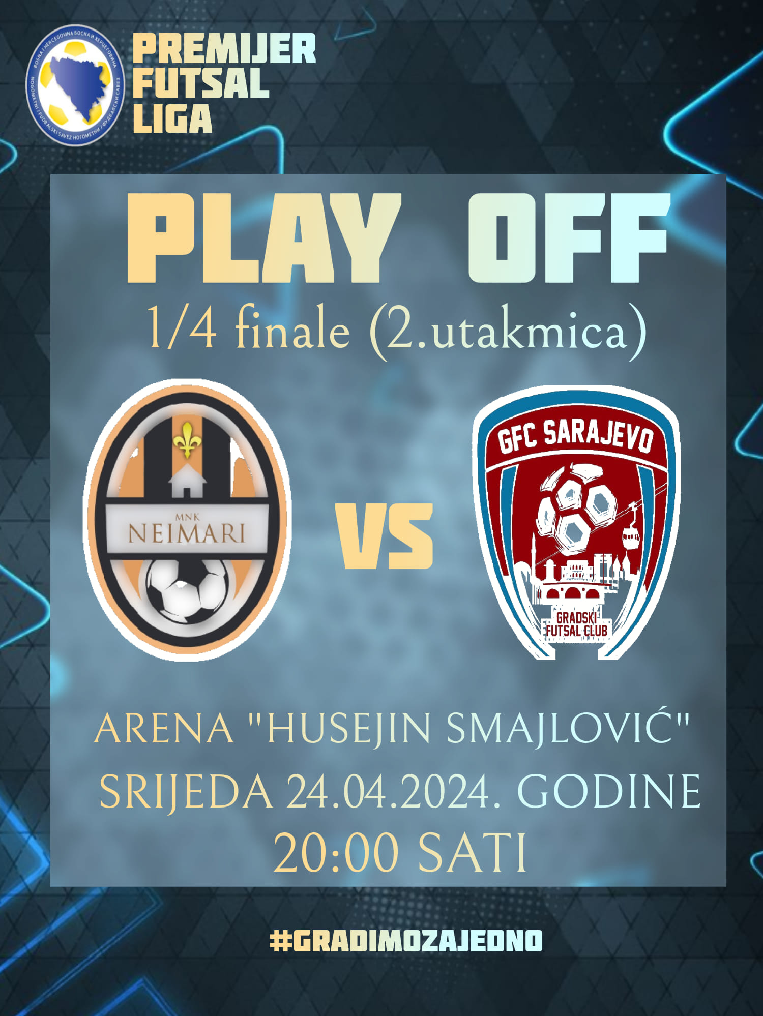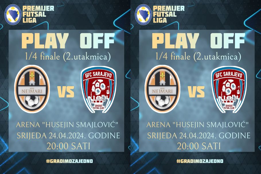 Ove srijede, 24.4.2024.godine, u Zenici se igra 2.utakmica četvrtfinala play offa za prvaka Bosne i Hercegovine u futsalu. Utakmica se igra od 20 sati u gradskoj Areni „Husejin Smajlović“ Zenica.