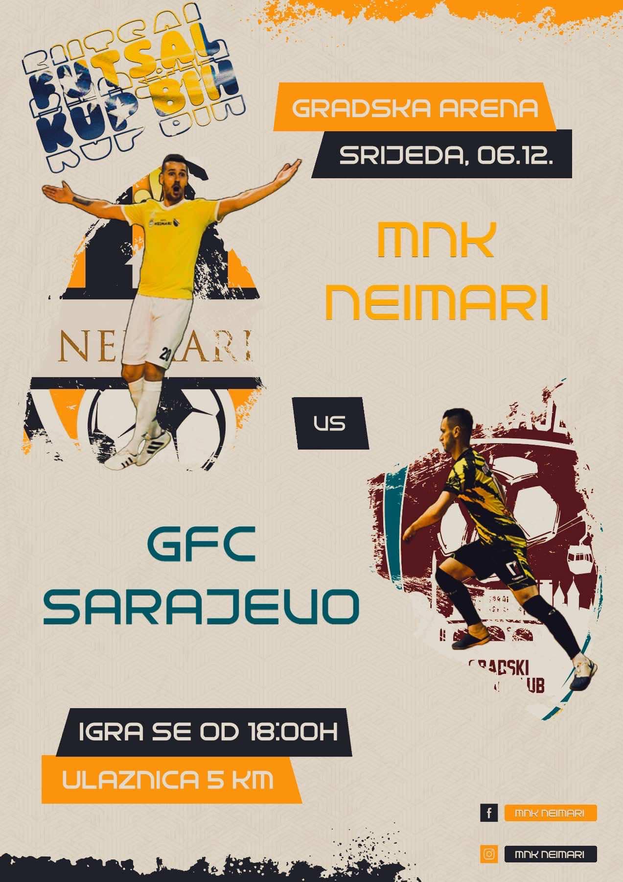 Predstojeće srijede, 06.12.2023.godine, na programu su utakmice osmine finala Futsal Kupa BiH za sezonu 2023/2024. U ovoj fazi takmičenja zenička ekipa MNK Salines-Neimari su domaćini ekipi GFC Sarajevo.