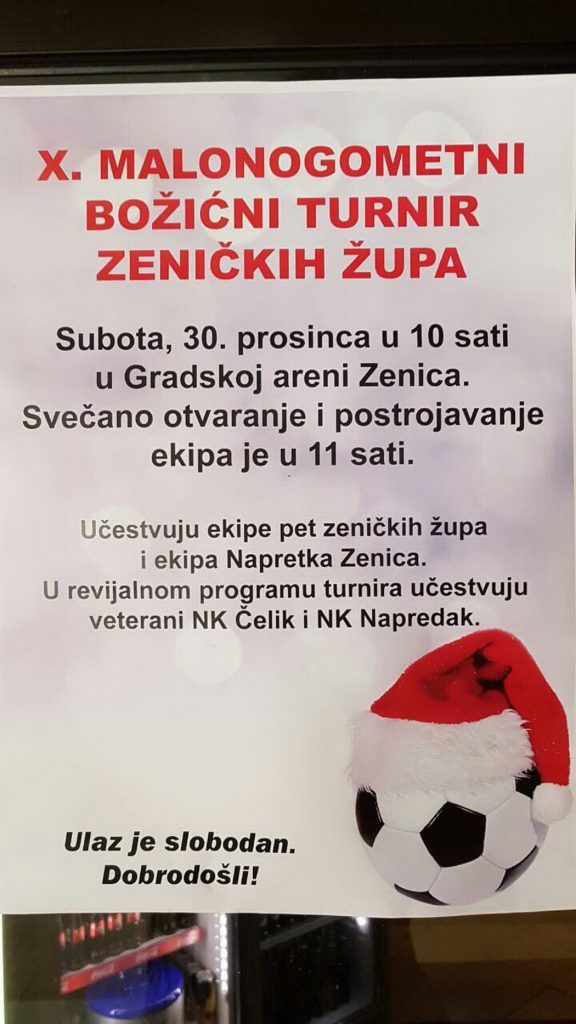 Ove subote 10. Božićni malonogometni turnir zeničkih župa – U subotu 30.decembra 2017.godine u Areni Zenica odigrat će se tradicionalni 10.Božićni malonogometni turnir zeničkih župa, koji počinje u 10 sati, a ulaz je slobodan.