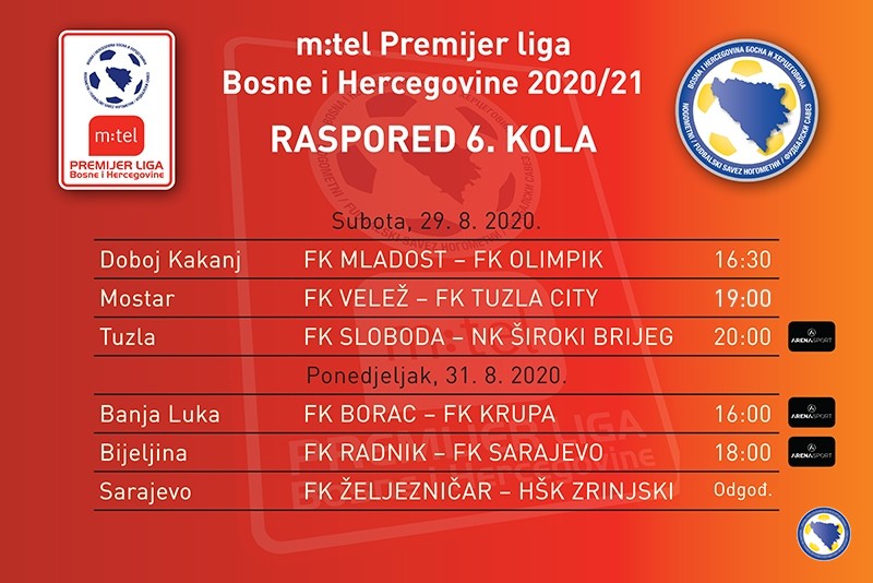 Ove subote i ponedjeljka na rasporedu šesto kolo M:tel Premijer bh. liga u nogometu – Šesto kolo m:tel Premijer bh. lige u nogometu bit će odigrano predstojeće subote i ponedjeljka, a bit će odigrano ukupno pet utakmica, pošto je meč Željezničara i Zrinjskog odgođen zbog obaveza ovih klubova na evropskoj sceni.