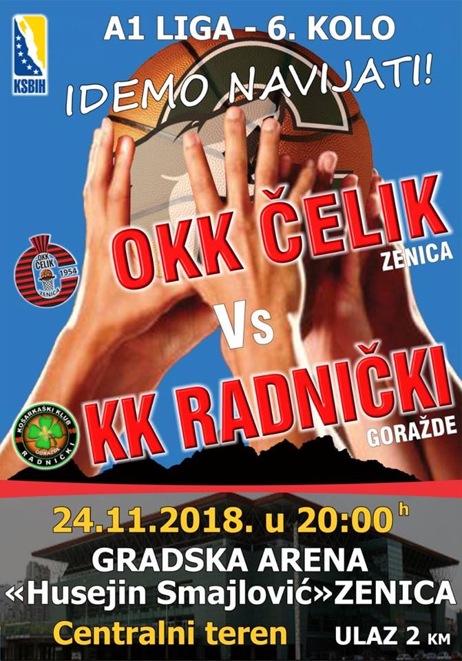 U drugoj večernjoj utakmici, a u okviru šestog kola A1 košarkaške lige KSBiH, sastaju se zenički OKK Čelik i KK Radnički iz Goražda. Utakmica je na rasporedu u subotu 24.11. u 20 sati na centralnom terenu gradske Arene.