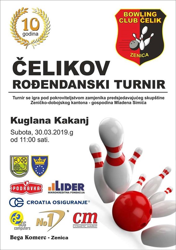 Najavljen je rođendanski kuglaški turnir KK Čelik u klasik kuglanju, koji će se održati u Kuglani u Kaknju ove subote, 30.3.2019.godine od 11 sati, pod pokroviteljstvom zamjenika predsjedavajućeg Skupštine ZDK, Mladena Simića. Za ovaj turnir uručeni su pozivi svim klubovima iz BiH sa oko 20-25 parova, miks i muških parova, registrovanih pri Kuglaškom Savezu BiH. Organizator je KK Čelik Zenica, a komisiju za takmičenje sačinjavaju Kenan Ćurovac, Zarfija Kubat i Milan Hreščak.