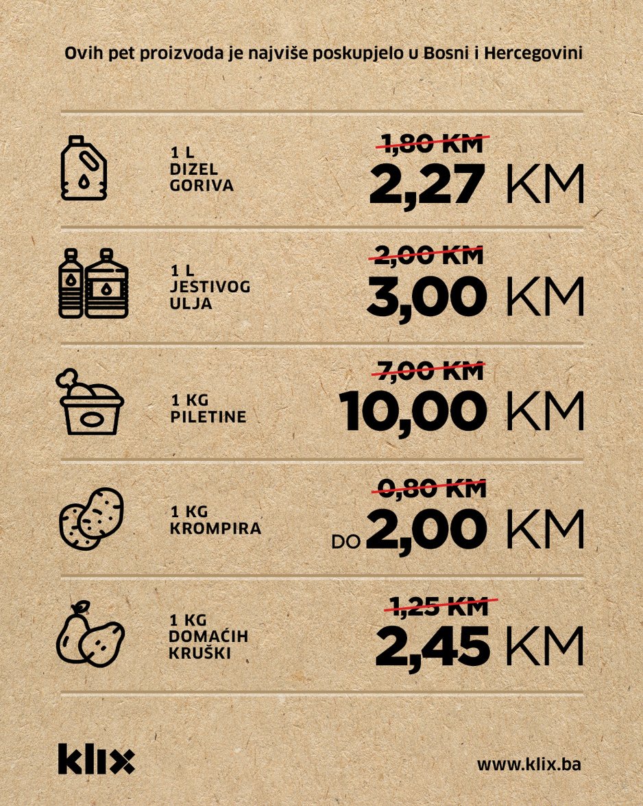 Cijena dizel goriva u prvoj i drugoj sedmici januara ove godine bila 1,80 KM, dok je ona sada minimalno 2,27 KM, a kreće se i do 2,46 u zavisnosti od benzinske pumpe. Cijena ulja početkom godine bila je 2 KM, a sada je ona negdje i više od 3 KM. Kilogram piletine mogli ste kupiti i za oko 7 maraka, dok je sada cijena oko 10 KM. Kada je riječ o povrću, najviše je porasla cijena krompira te se on prošle godine mogao kupiti za 0,80 KM, dok je njegova cijena sada od 1,50 do čak 2 KM. Domaća kruška, primjera radi u oktobru prošle godine, u marketima u BiH koštala je 1,25 KM, dok je sada 2,45 KM.