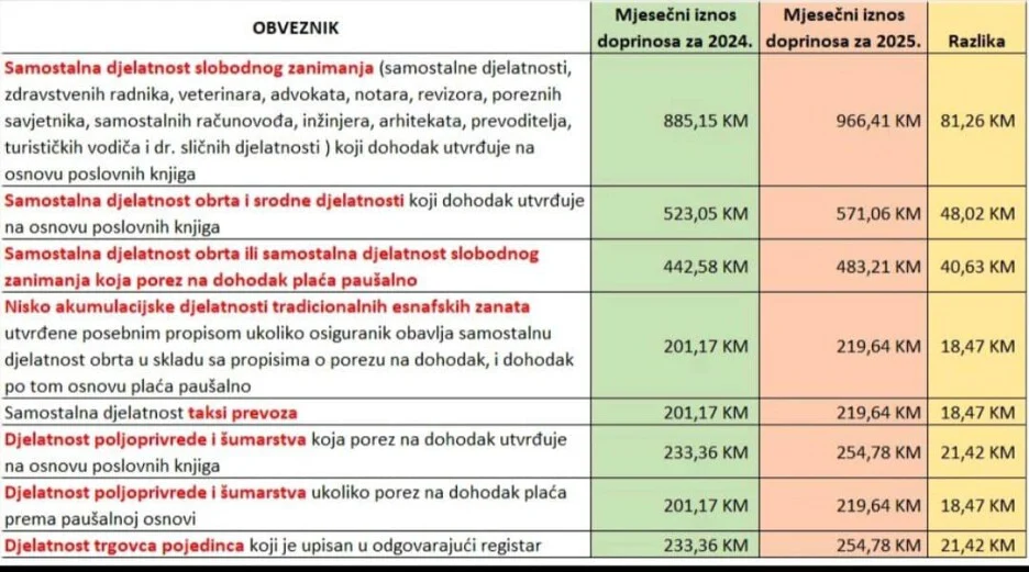 Ranije je federalni ministar razvoja, poduzetništva i obrta Vojin Mijatović, na temu minimalne plate koja u FBiH od 1. januara iznosi 1.000 KM, objavio i razliku u iznosu mjesečnih doprinosa (odnos 2024. i 2025. godine) koji će biti uplaćivani prema vrsti poreskih obveznika (tabela iznad).