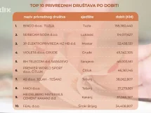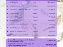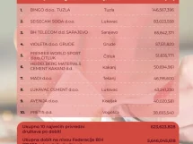 Pretprošle godine u FBiH je također bilo 27.995 firmi s ukupnim prihodom od 59,40 milijardi KM. Od tog ukupnog prihoda, 9,21 milijarda KM je ostvarena u 10 najvećih kompanija. Udio 10 najvećih kompanija u ukupnim prihodom iznosio je 13,3 posto.