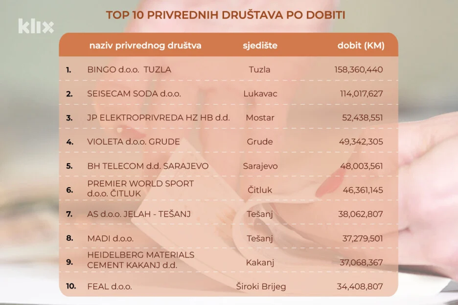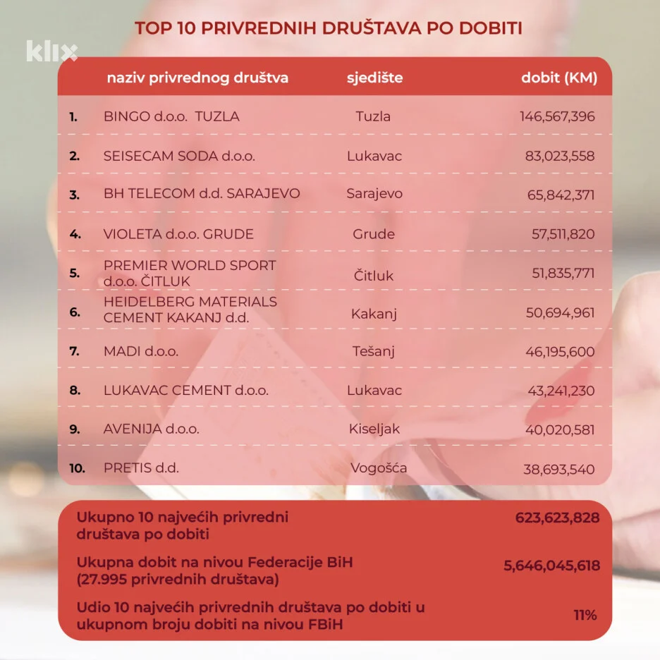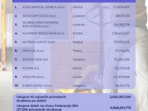 Ukupna dobit je iznosila od 5,26 milijardi KM, od čega su 615,34 miliona KM ostvarena u 10 najvećih kompanija. Udio 10 najvećih kompanija u ukupnoj dobiti iznosio je 11,7 posto.