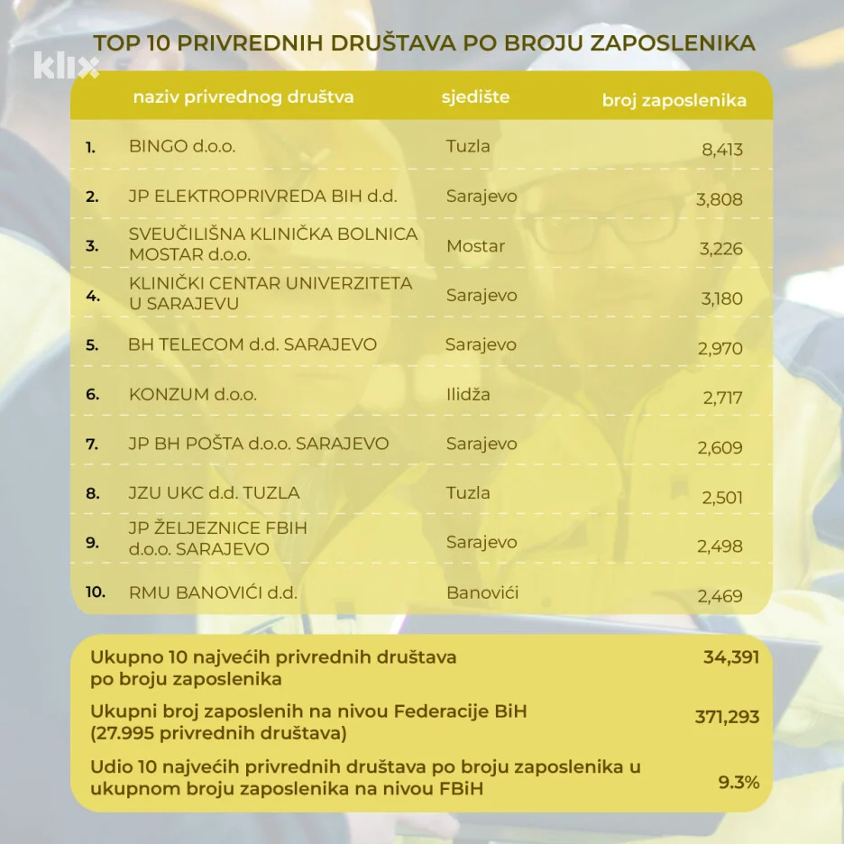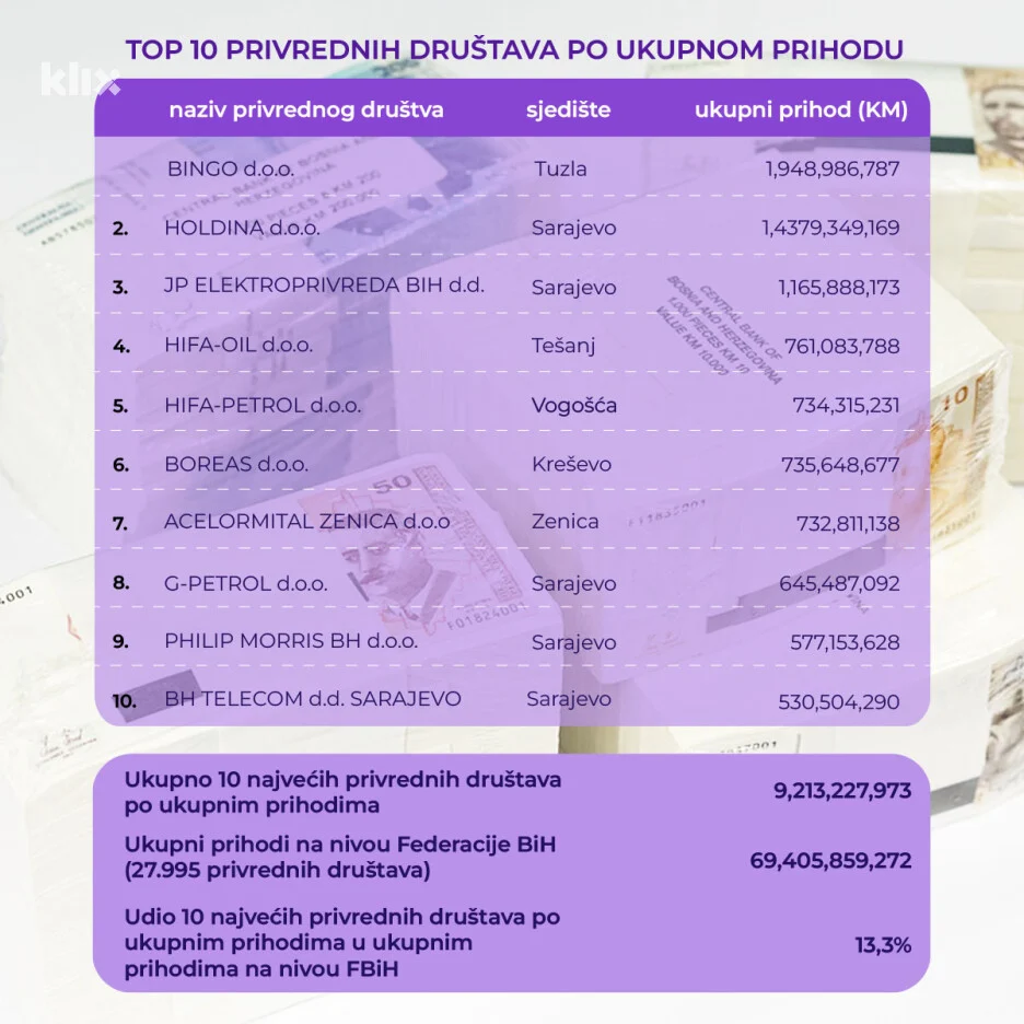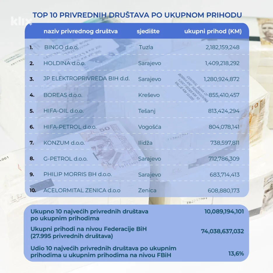 Prošle godine u FBiH je bilo 27.995 firmi s ukupnim prihodom od 74,03 milijarde KM. Od tog ukupnog prihoda, više od 10 milijardi ostvareno je 10 najvećih kompanija. Udio 10 najvećih kompanija u ukupnom prihodu iznosio je 13,6 posto.