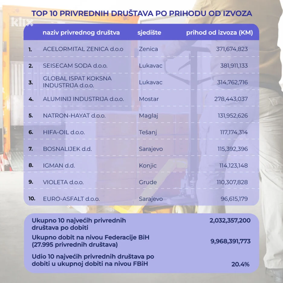 Ukupni prihod od izvoza je iznosio 9,96 milijardi KM, od čega je više od dvije milijarde KM ostvarene u 10 najvećih kompanija. Udio 10 najvećih kompanija u ukupnom prihodu od izvoza je iznosio 24,4 posto.