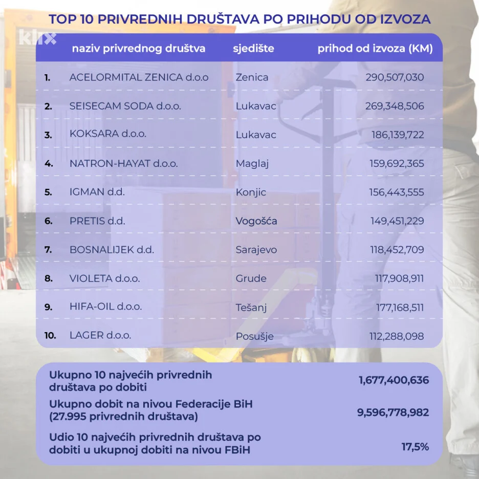 Ukupni prihod od izvoza je iznosio 9,59 milijardi KM, od čega je 1,67 milijardi KM ostvareno u 10 najvećih kompanija. Udio 10 najvećih kompanija u ukupnom prihodu od izvoza iznosio je 17,5 posto.