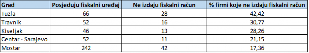 Prema izvještaju napravljenom nakon izvršenih inspekcijskih nadzora širom FBiH u periodu od 3. oktobra do 7. decembra ove godine, FUIP je identificirao općine u kojima najveći procenat kontroliranih firmi ne izdaje fiskalni račun. Shodno njihovim zaključcima, Faktor je identificirao pet općina u FBiH u kojima najveći procenat firmi ne izdaje fiskalni račun. Te općine su navedene u sljedećoj tabeli.