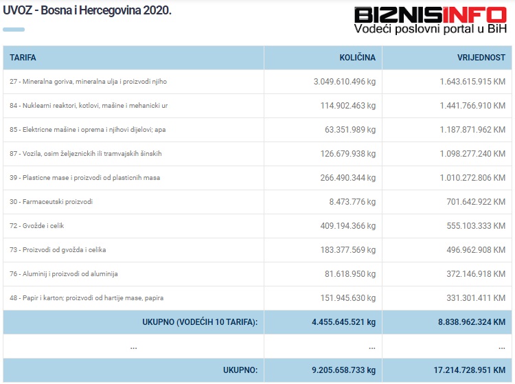 Kada je riječ o uvozu, glavni proizvod su mineralna goriva i mineralna ulja, kojih smo lani uvezli u vrijednosti od 1,6 milijardi KM.