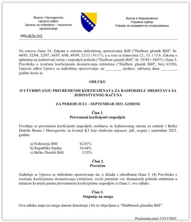 Sljedeće sedmice bi trebao zasjedati Upravni odbor Uprave za indirektno oporezivanje (UIO) koji će glasati o odluci za utvrđivanje privremenih koeficijenata za raspodjelu novca od indirektnih poreza.