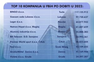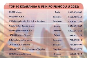 Treba istaći da u odnosu na 2021. godinu među top 10 kompanija po prihodima u FBiH nema BH Telecoma i Elektroprivrede HZ-HB dd Mostar.