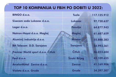 Pretprošle, 2021. godine, lista top 10 kompanija po dobiti je izgledala ovako: ArcelotMittal (199 miliona KM), Bingo (86 miliona KM), BH Telecom (64 miliona KM), GIKIL (62 miliona KM), Feal (49 miliona), Premier World Sport (44 miliona KM) Elektroprivreda HZ-HB (42 miliona KM), Natron-Hayat (33,5 miliona KM) i AXPO (33,2 miliona KM).