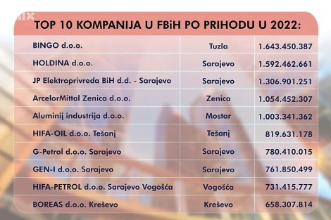 Ovo je top 10 kompanija po prihodu i dobiti u 2022. godini u Federaciji BiH