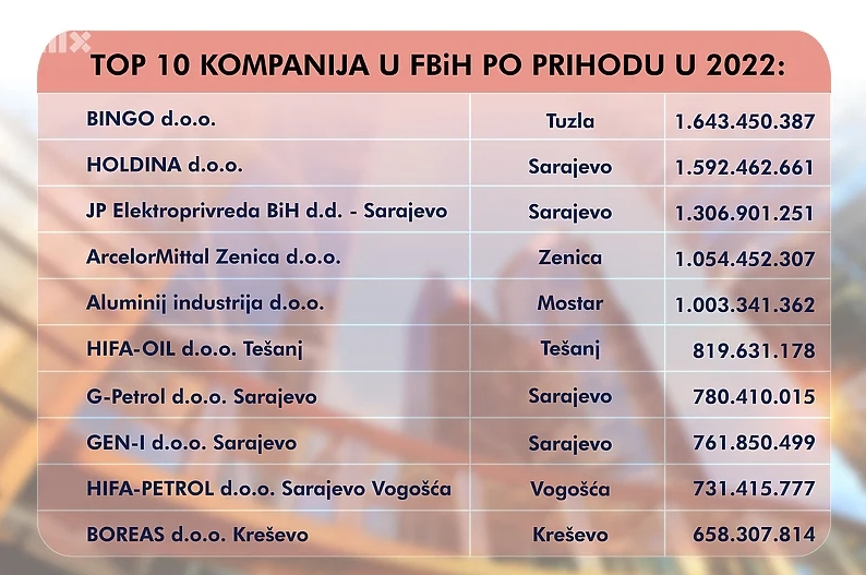 Ovo je top 10 kompanija po prihodu i dobiti u 2022. godini u Federaciji BiH
