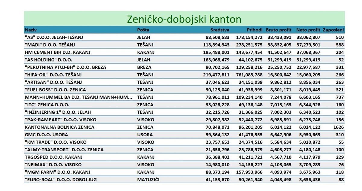 Top 20 kompanija iz ZDK, kantona za kojeg se nerijetko kaže da je motor razvoja FBiH, imalo je prihode veće od dvije milijarde KM, te su ostvarile dobit veću od 260 milona KM. Najviše ih je iz Tešnja, pa i ne čudi činjenica da je ovaj grad dospio na listu renomiranog svjetskog časopisa “Financial Times” među top deset mikrogradova budućnosti.