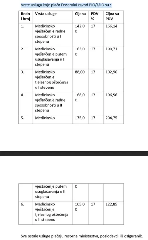 Za usluge medicinskog vještačenja u oblasti penzijskog i invalidskog osiguranja, primjenjuje se važeći cjenovnik usluga medicinskog vještačenja Instituta. Izuzetno od stava 3. ovog člana, troškove medicinskog vještačenja može snositi i osiguranik na kojeg se medicinska vještačenja odnose, kao i poslodavac kod koga je osiguranik zaposlen – navode iz Zavoda PIO FBiH.