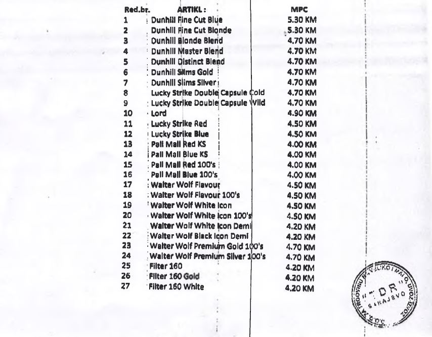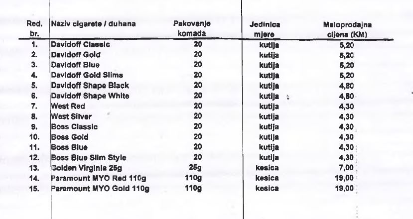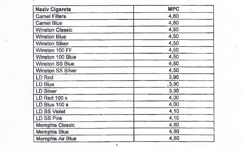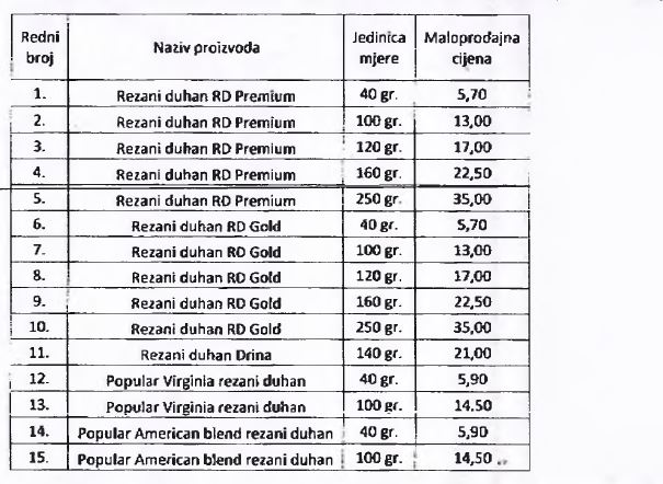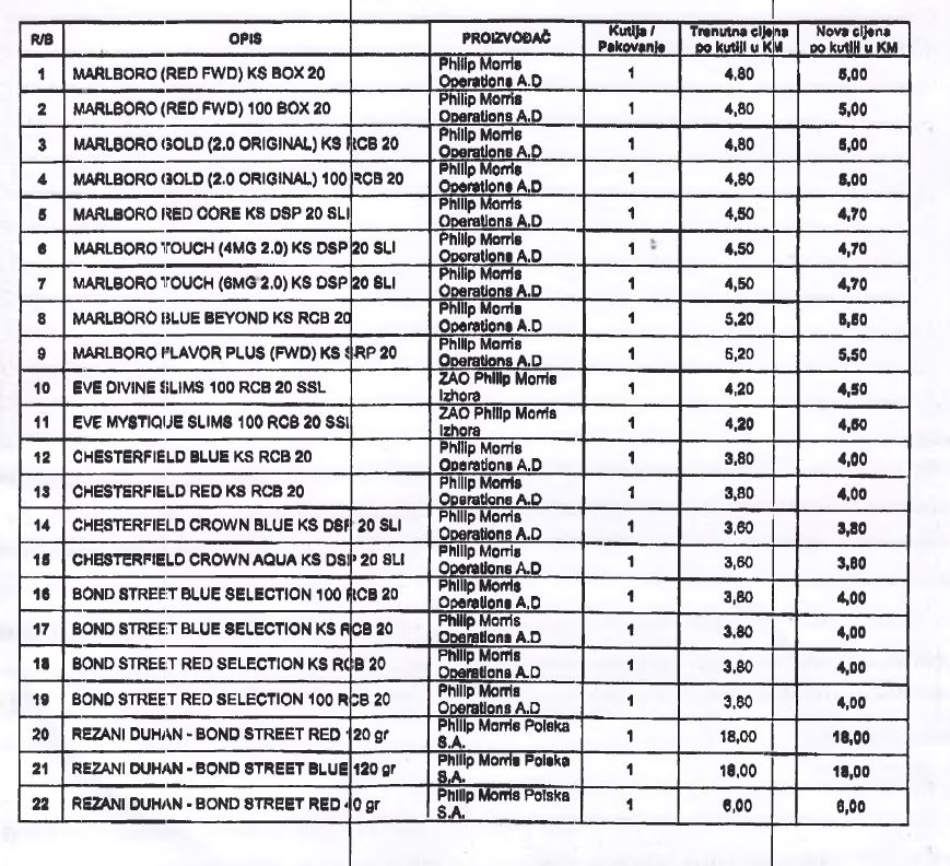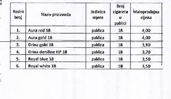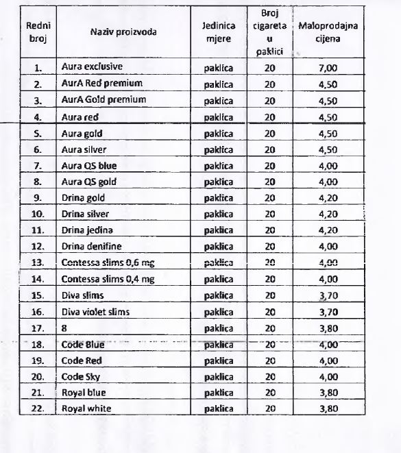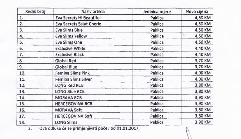 Proizvođači i distributeri cigareta bili su dužni da do 30. novembra 2016. godine u UIO dostave nove maloprodajne cijene cigareta koje će biti na snazi od početka 2017. godine, a koje su utvrđene u skladu s Odlukom o utvrđivanju posebne i minimalne akcize na cigarete i iznos akcize na duhan za pušenje za 2017. godinu, koju je nedavno usvojio Upravni odbor Uprave za indirektno oporezivanje.