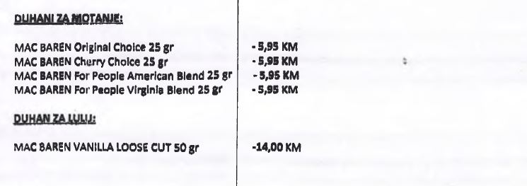Odlukom o utvrđivanju posebne i minimalne akcize na cigarete i iznos akcize na duhan za pušenje za 2016. godinu je definisano da će se od 1. januara 2017. godine, na cigarete plaćati proporcionalna akciza po stopi od 42 posto maloprodajne cijene cigareta i specifična akciza u iznosu od 67,50 KM za 1.000 komada, odnosno 1,35 KM za pakiranje od 20 komada, navodi N1.