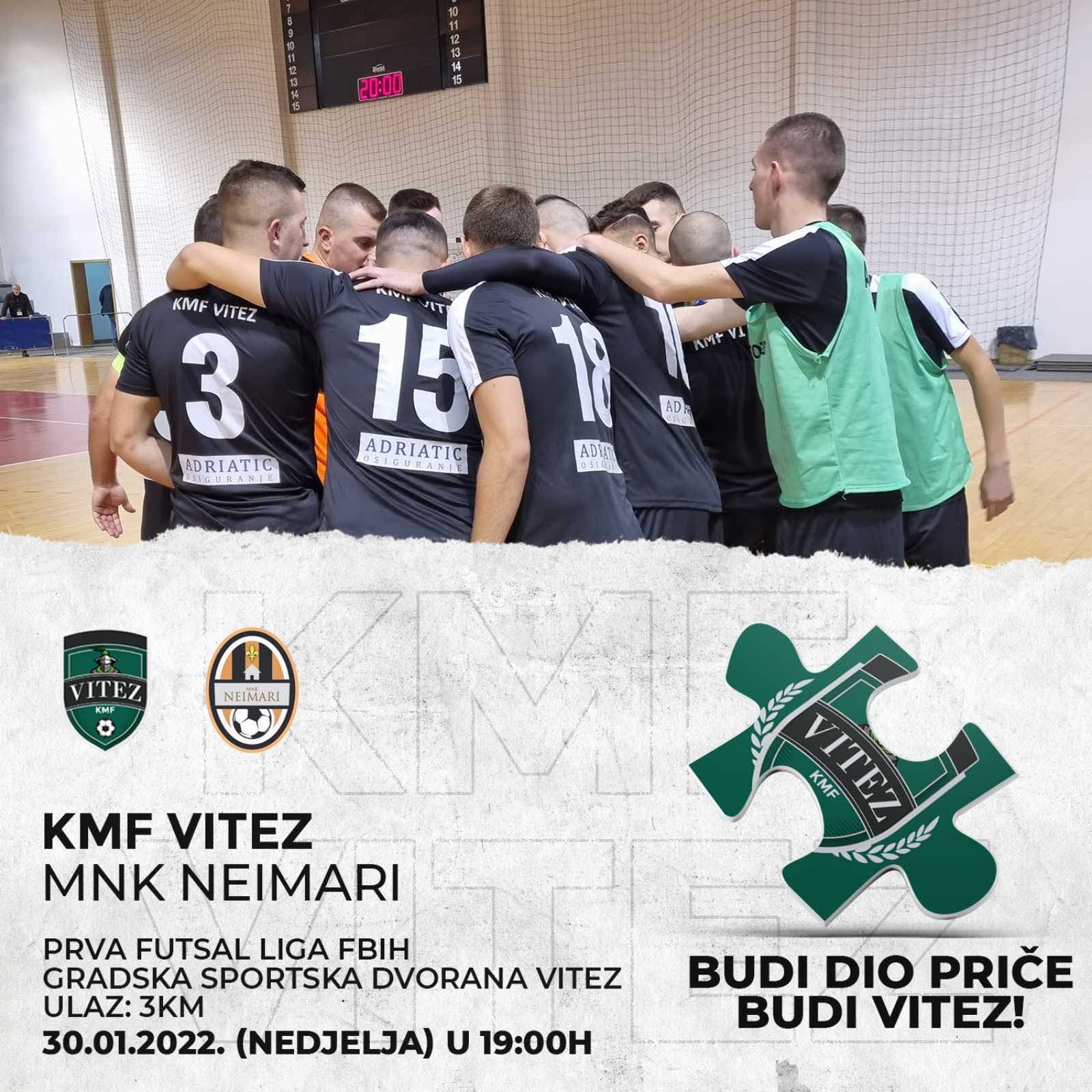 Predstojećeg vikenda, 29. i 30.01.2022.godine, utakmicama 8.kola kreće drugi dio sezone u Prvoj futsal ligi FBiH, grupa 1, u kojoj nastupa i zenička ekipa, MNK „Neimari“. Ovo je prvo kolo u proljetnom dijelu sezone. U ovom kolu zenički Neimari gostuju u Vitezu kod ekipe MMF Vitez, koju su pobjedili u Zenici u prvom kolu sa 2:1. Utakmica se igra u nedjelju 30.01.2022. godine sa početkom od 19:00 sati u gradskoj sportskoj dvorani u Vitezu, ulaz je 3 KM.