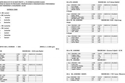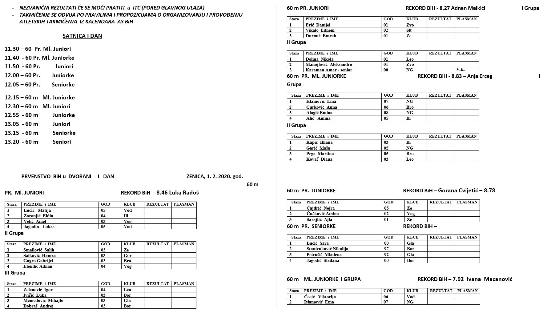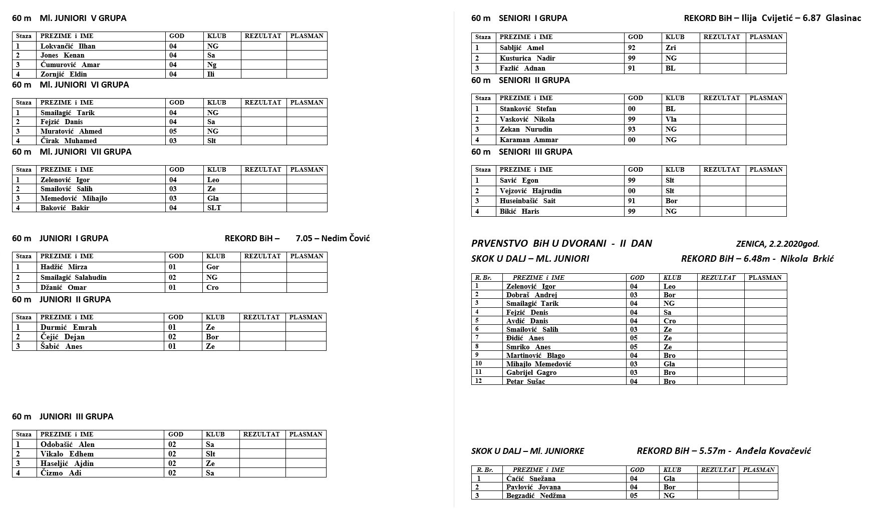 Atletski klub „Zenica“, ovog vikenda 01./02.2.2020.godine, će biti domaćin i organizator dvoranskog Prvenstva u atletici u šest kategorija (Mlađi juniori, mlađe juniorke, juniori, juniorke, seniori i seniorke).