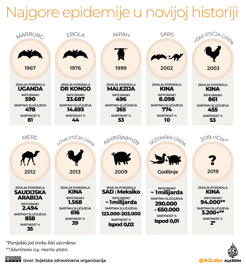 Ozbiljnost korona virusa – poređenje epidemija – Uporedili smo najgore virusne epidemije koje su se, u novijoj historiji, sa životinja prenijele na čovjeka.