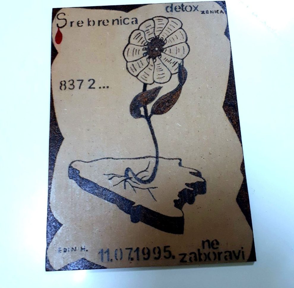 Ovim povodom, pacijent na Odjeljenju za stacionarni tretman Zavoda za bolesti ovisnosti Zeničko-dobojskog kantona, u sklopu radno-okupacione terapije, izradio je cvijet Srebrenice pomoću tehnike pirografija.
