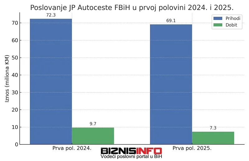 Ukupni prihodi Javnog preduzeća Autoceste Federacije BiH u prvoj polovini ove godine iznosili su 69,1 milion KM.