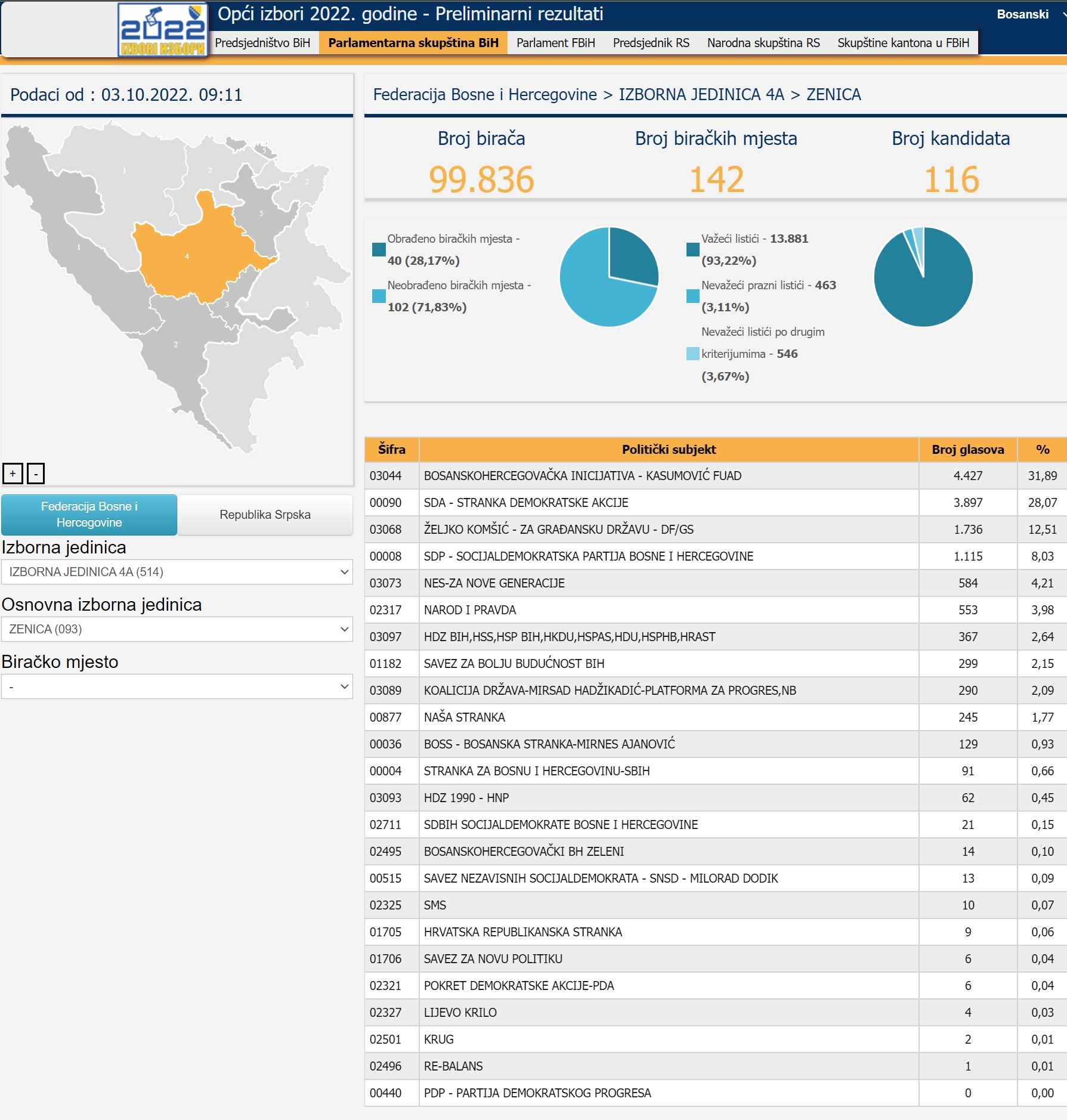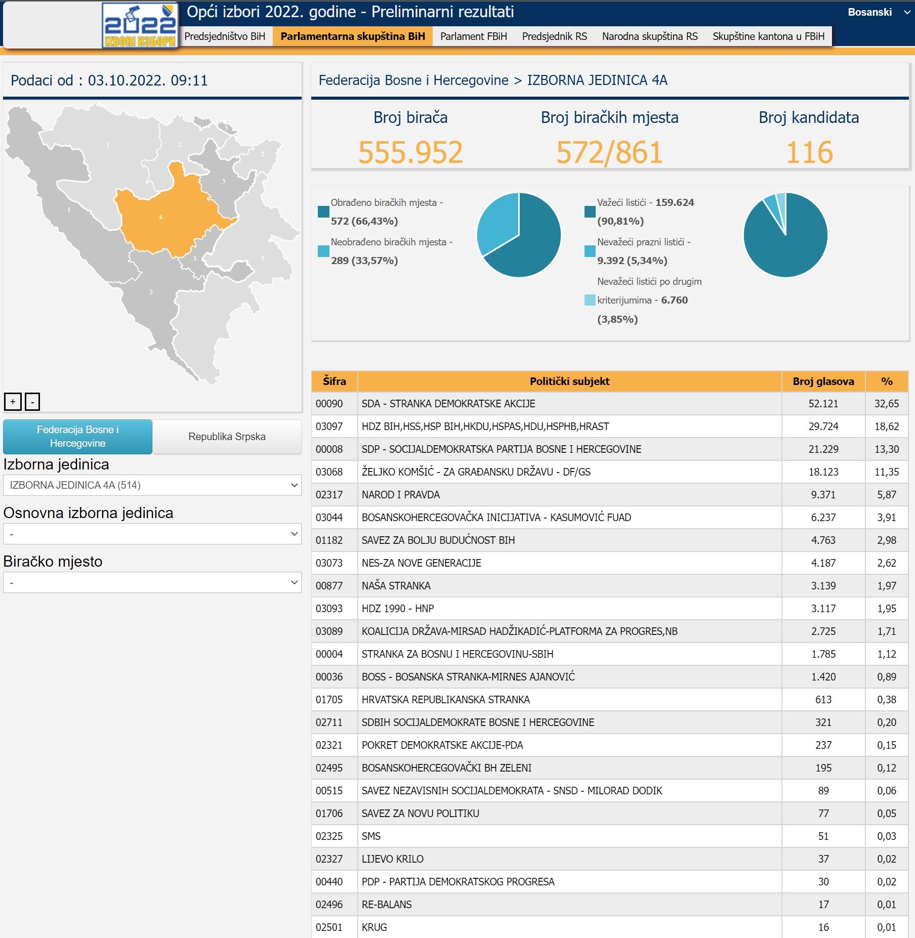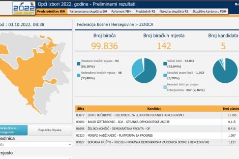 Izborni prag prešli su i Narod i pravda 5,87, te BHI – KF sa 3,91 posto, dok nešto ispod cenzusa imaju trenutno (09.11h, 03.10.2022.) SBB BIH 2,98, NES 2,62…