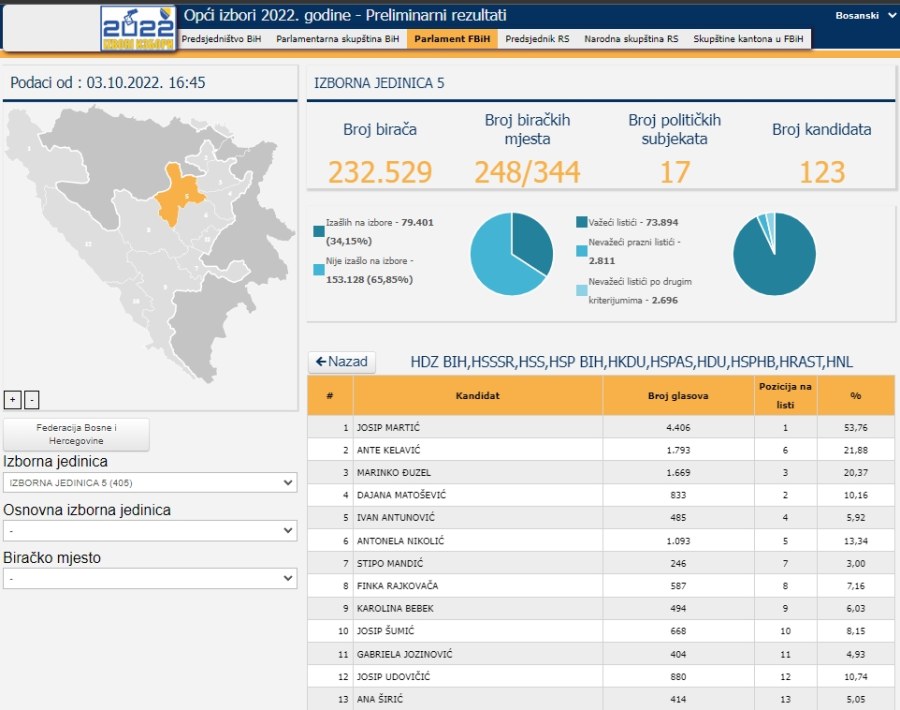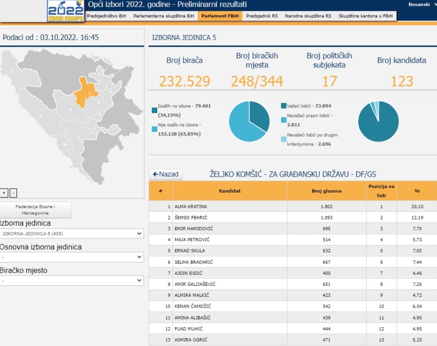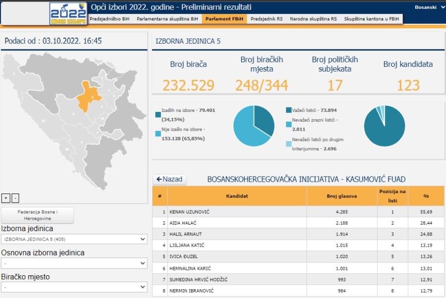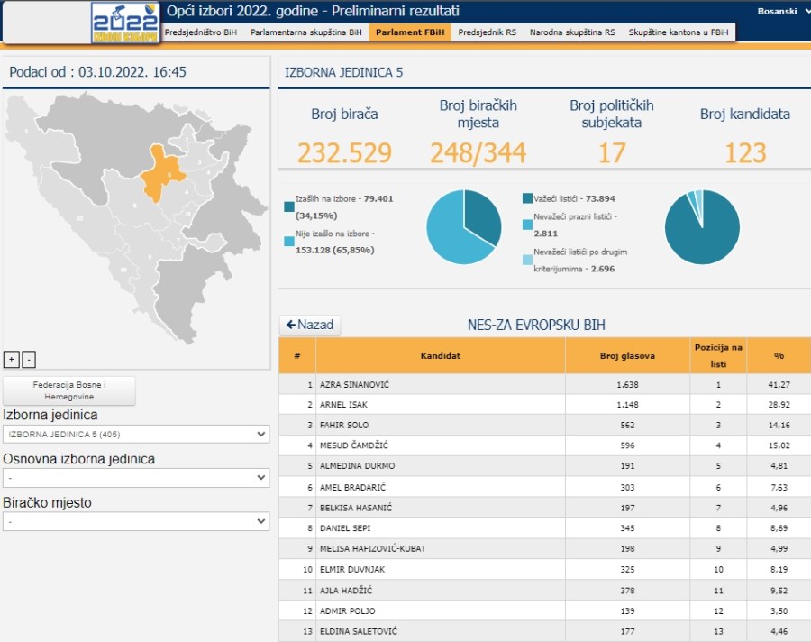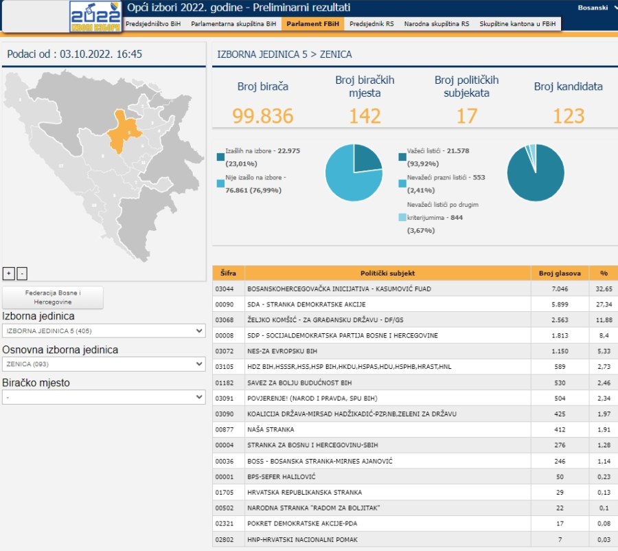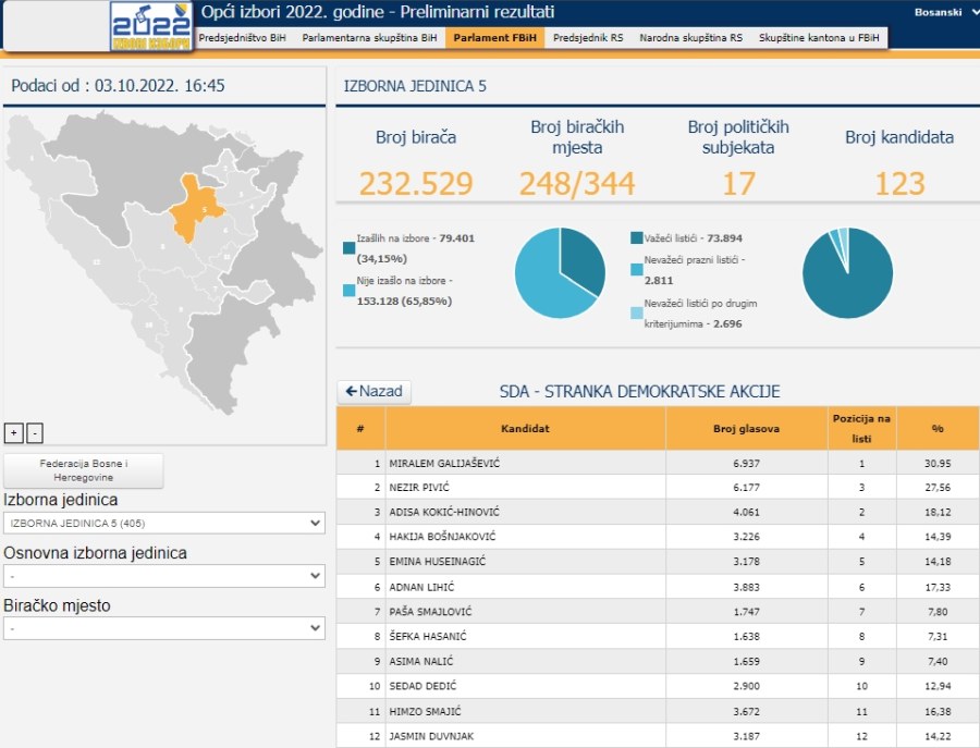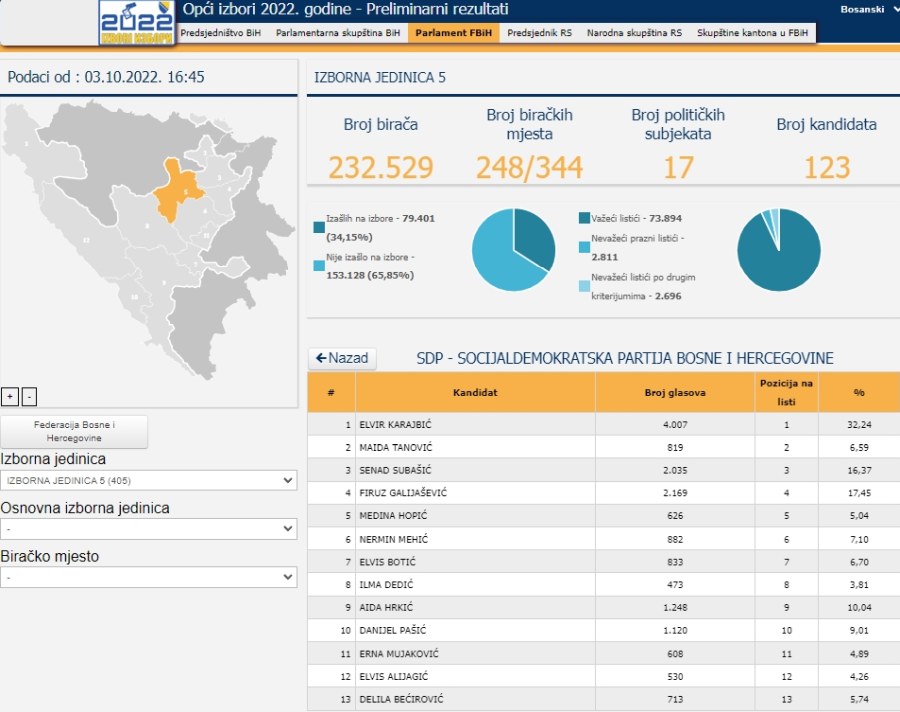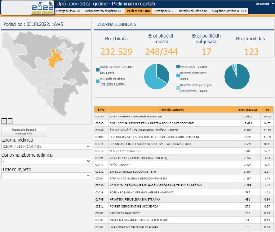 Prema podacima ažuriranim u 16.45 sati u ponedjeljak 3. oktobra, ažurirana je trećina pristiglih podataka za Parlament Federacije BIH, iz kvote Izborne jedinice 5, koja obuhvata dio Zeničko-dobojskog kantona, od Zenice ka sjeveru Kantona.